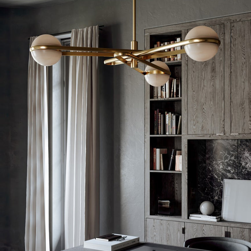 Gorgeous alabaster globes wrapped at the center by a band of Vintage Brass give the Kyomi wall sconce and chandelier a retro look that feels current. Mount the chandelier close to the ceiling to add instant glam to any space.