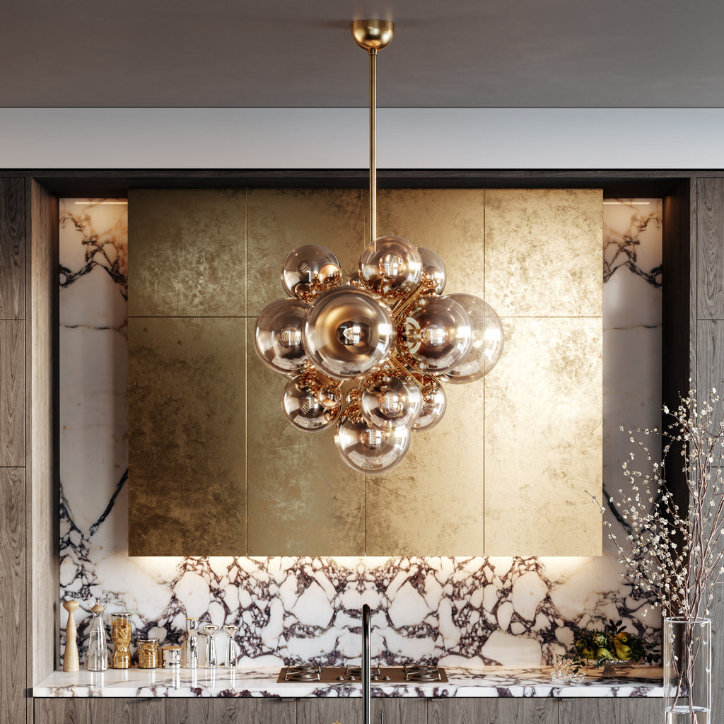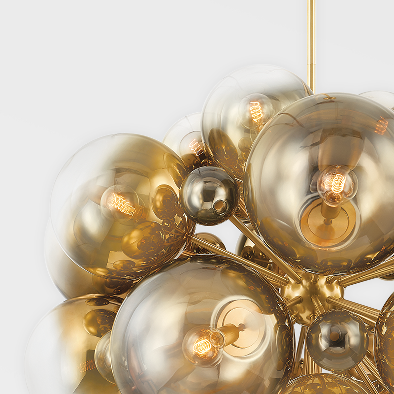 This showstopper features clusters of ombre glass globes in various sizes. Each orb transitions from brass to clear and the ombre lighting effect is simply stunning. Whether a chandelier, flush mount, sconce or linear, Kyoto will be the focal point in any space.