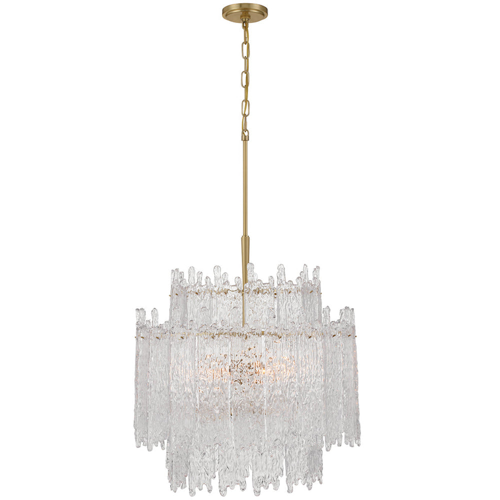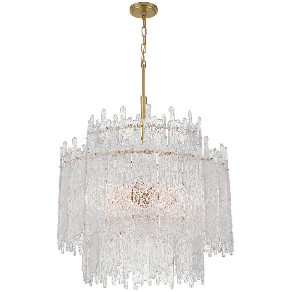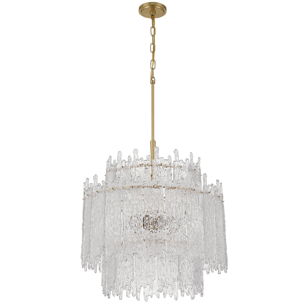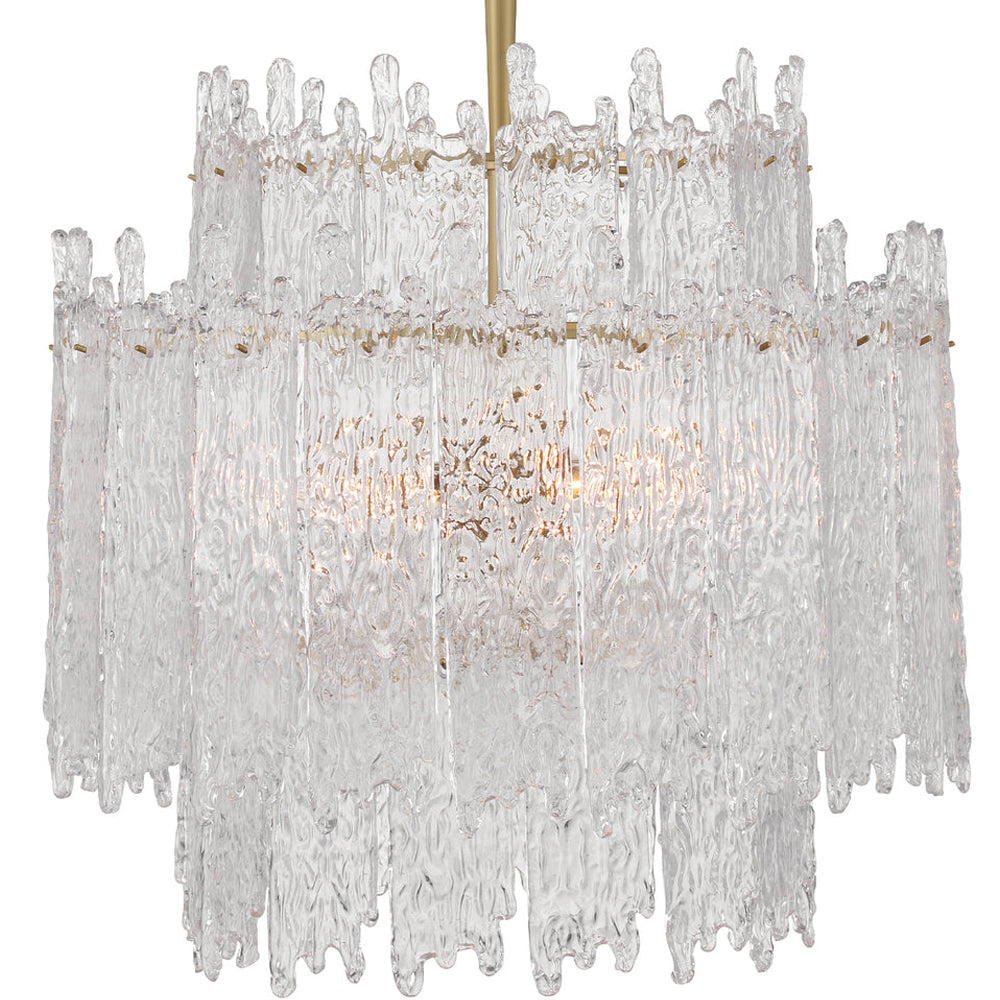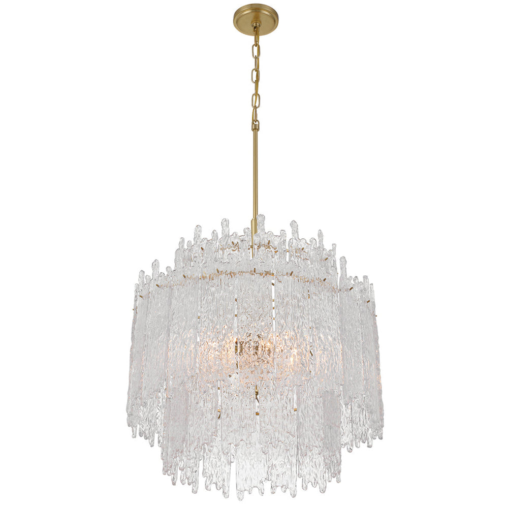 The Ackerly Collection showcases stunning ice glass, a textured material that resembles frozen or cracked ice. Its frosted, crystalline surface uniquely scatters light, producing a soft, diffused glow. This organic, sculptural effect adds a modern yet slightly retro touch to the design. The Ackerly Collection combines elegance with an artistic, edgy aesthetic, making it a standout in any space.