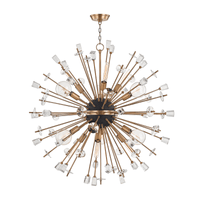 The Liberty Chandelier by Hudson Valley displays a perfect mix of functionality and design. At the center of this striking piece of craft lies a black metal sphere. This is surrounded by a metal band that presents a visible contrast to the black sphere in brass and nickel finishing. This is accentuated by the protruding metal rods embellished with handcrafted glass discs, filament bulbs. BRAND NEW. OVERSTOCK SALE.