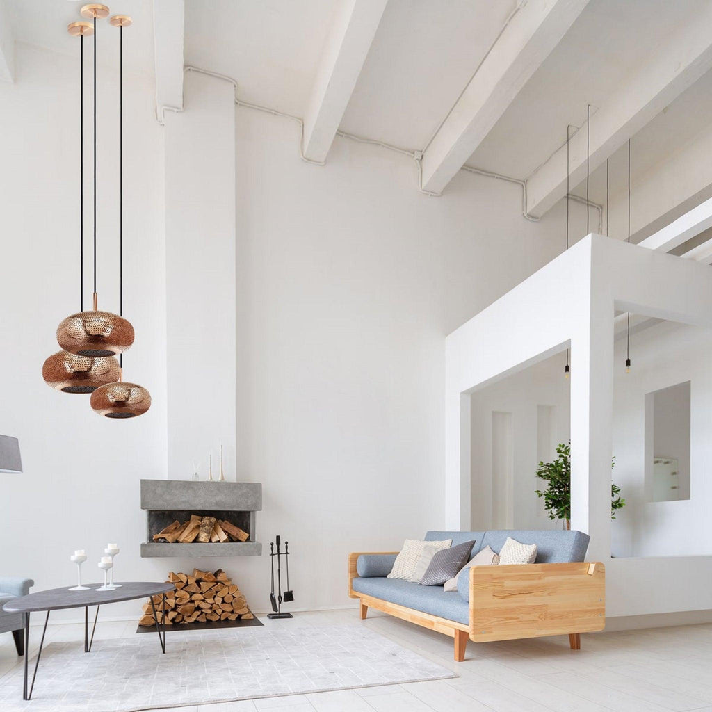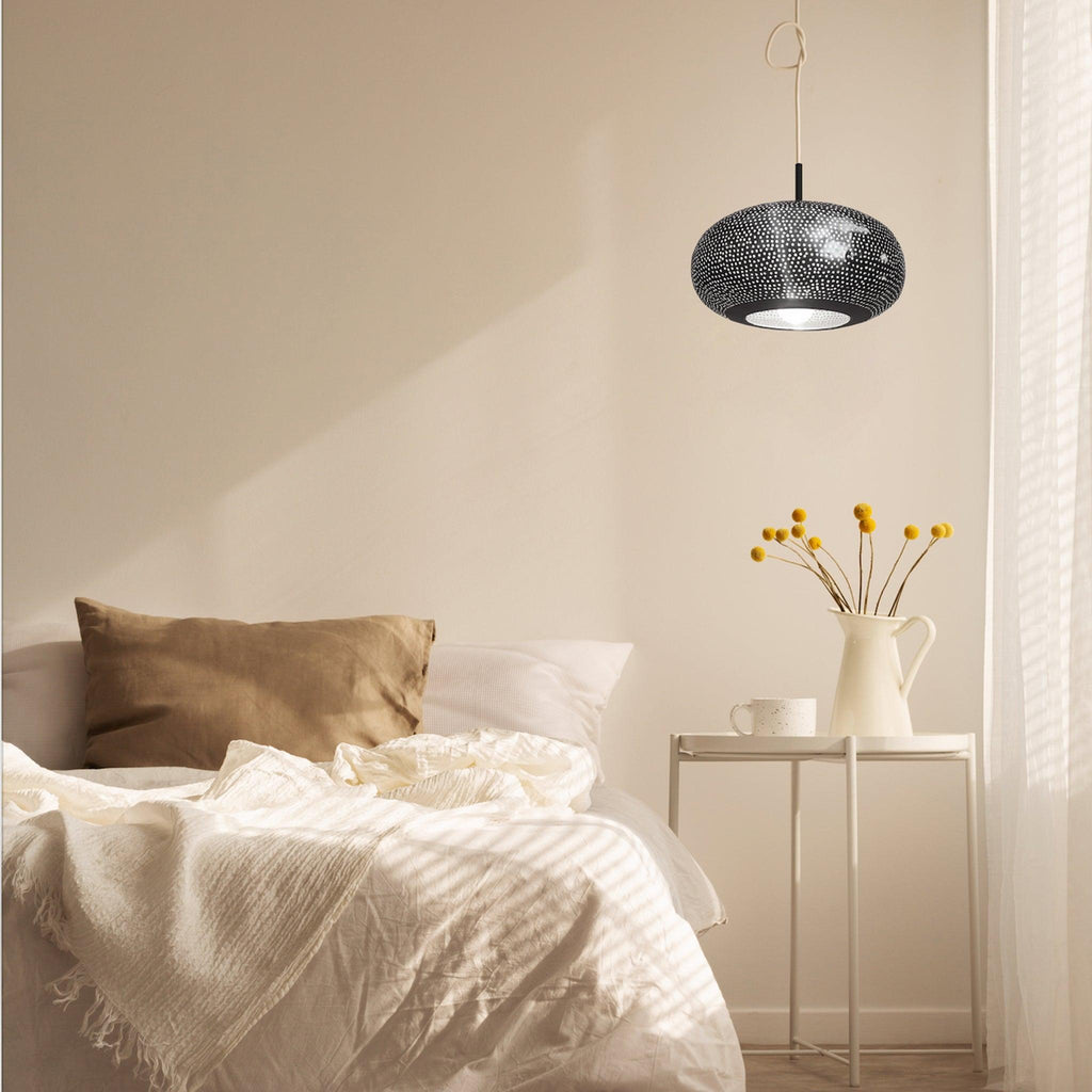 Lila is an oval-shaped pendant light, with its simple sculptural shape and its pierced shade casts brilliant shadows onto the ceiling and onto the space around it, while creating a focused light at the base. It provides an abundant, yet diffused light making it a perfect addition to dining and living spaces.