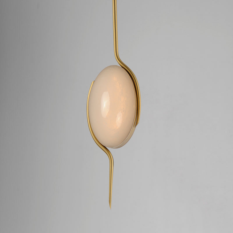 The alluring visual effect of a milky cloud marble glass provides elegant luminosity. Backlit with evenly diffused LED lighting the fixtures resonate like a vibrant musical note. The fixture is elongated with avertical metal spike finished in Natural Aged Brass that hugs the glass' shape as it extends in both directions. These elements end in an angle-cut edge which adds visual contrast not only in color but in feeling. The sharpness of a clasp to the softer orb of the marbling white glass. An embodiment of lighting as a jewel, the Locket evokes both the opulence and sentimentality of designer accessories.