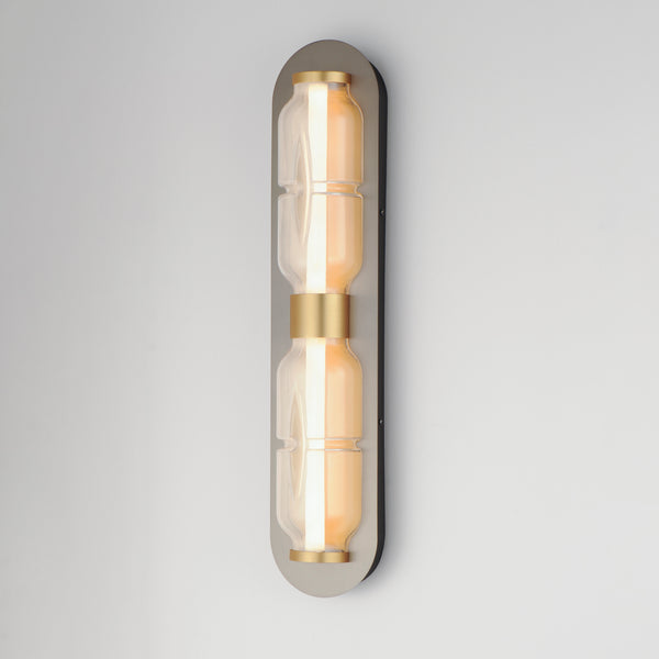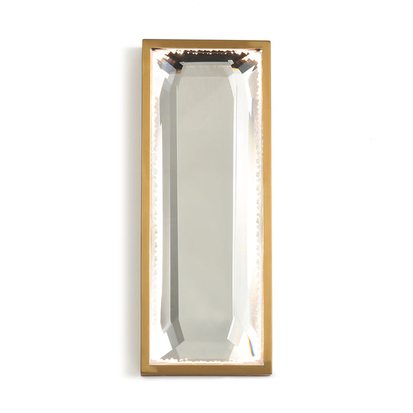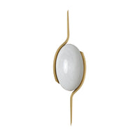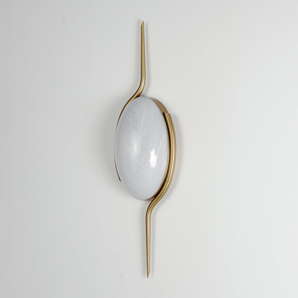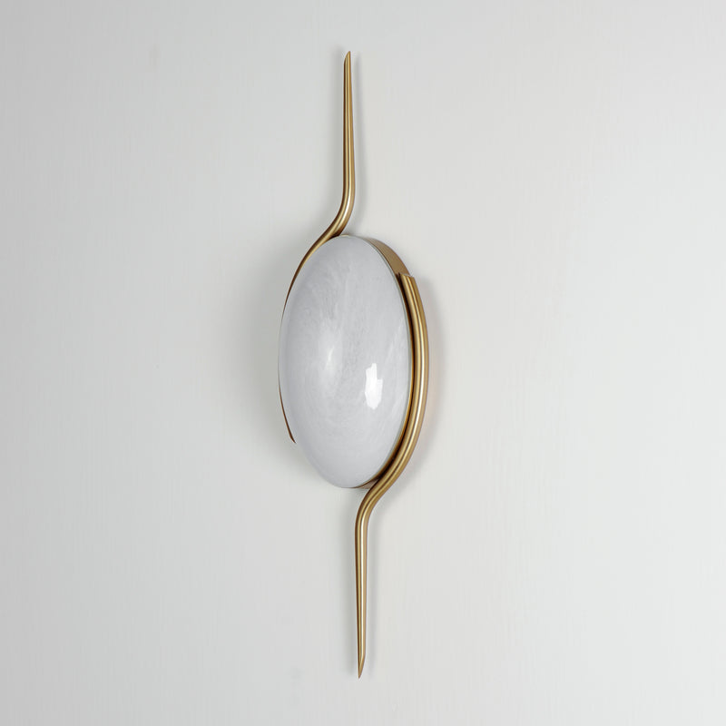 The alluring visual effect of a milky cloud marble glass provides elegant luminosity. Backlit with evenly diffused LED lighting the fixtures resonate like a vibrant musical note. The fixture is elongated with avertical metal spike finished in Natural Aged Brass that hugs the glass' shape as it extends in both directions. These elements end in an angle-cut edge which adds visual contrast not only in color but in feeling. The sharpness of a clasp to the softer orb of the marbling white glass. An embodiment of lighting as a jewel, the Locket evokes both the opulence and sentimentality of designer accessories.