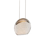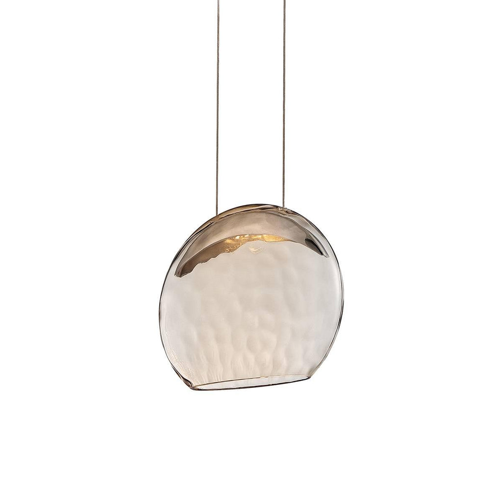 The Lolli dweLED Pendant by WAC Lighting is a beautiful creation that spells panache from every nook and corner. Compactly-designed to be used in varying settings, this pendant light has been created by using an oval-shaped glass that is tipped with a bronze-effect to complement the hammered texture etched on its surface. This mouth-blown glass panel is suspended by using two sleek rods and they work comfortably with a crescent-shaped die-cast LED panel to offer diffused illumination like rays of sunlight. The use of a chrome finish further enhances its overall appearance.