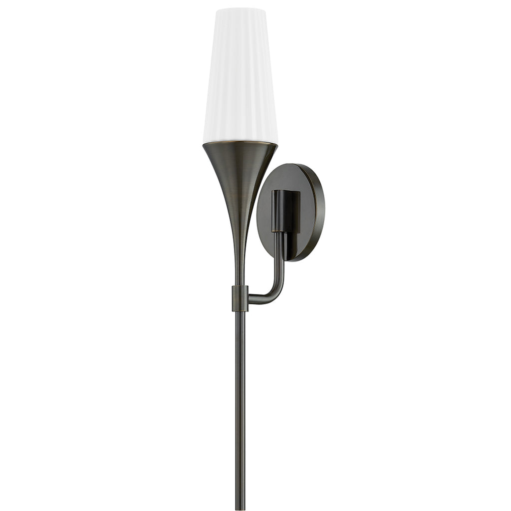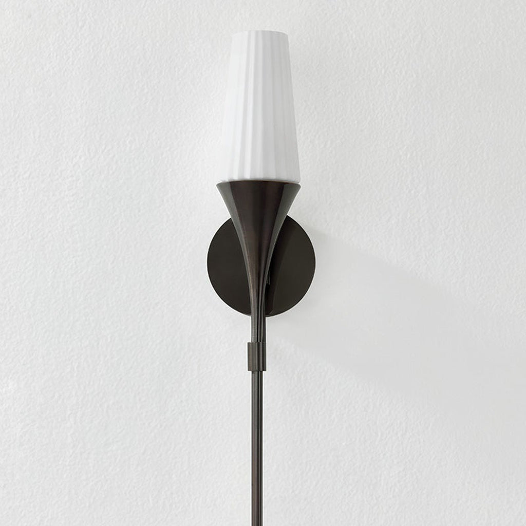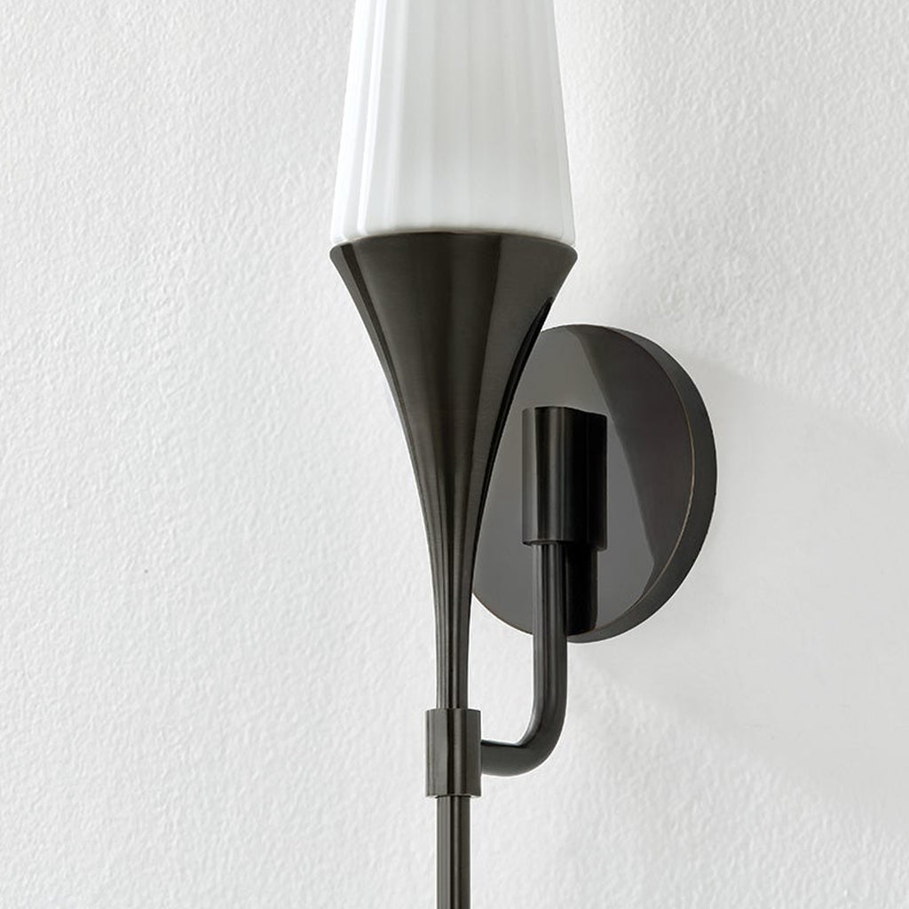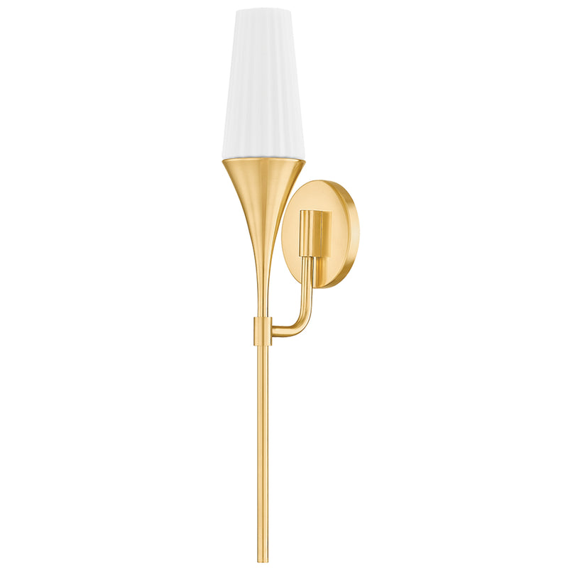 Luisa is a modern heirloom for the home. Reminiscent of a vintage torch, this elegant sconce is supported by a slender L-shaped arm. While the fluted matte opal shade nods to classical aesthetics, the elongated proportions and minimalist hardware details modernize the fixture. Available in an Aged Brass or True Bronze finish.
