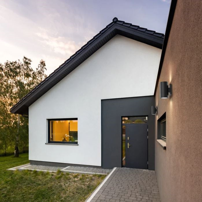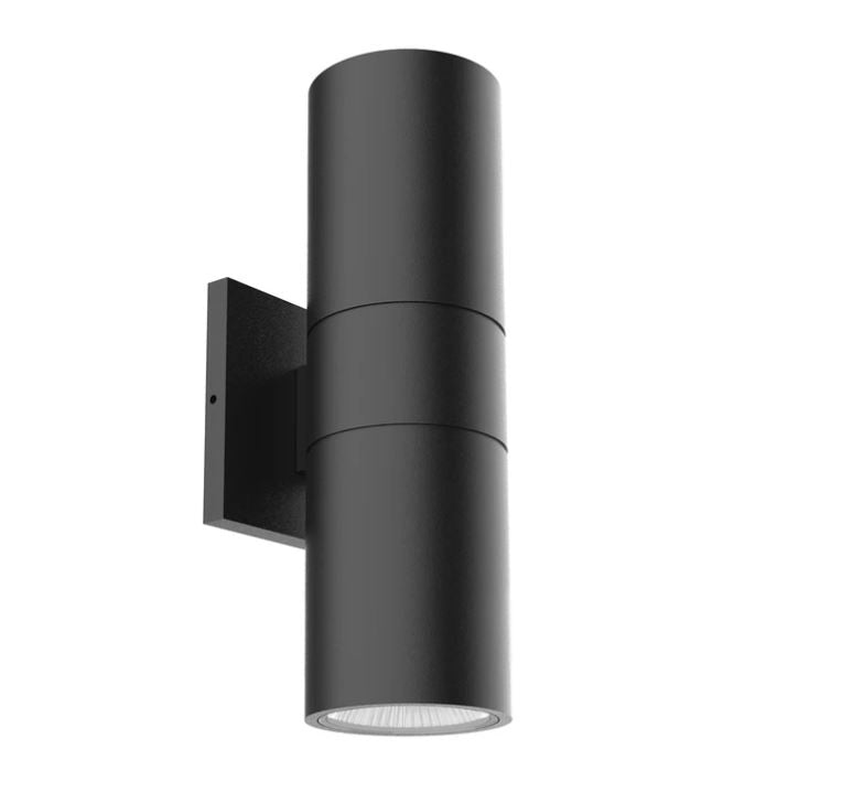High powered LED exterior two light wall mount fixture, die-cast aluminum housing molded into a cylinder shape in powder coated gray or black finish. Concealed inside is 120V AC LED technology with a tempered glass diffusers radiating light upward and downward against the wall where installed. Certified ETL wet location listed and is available in different sizes and one light options