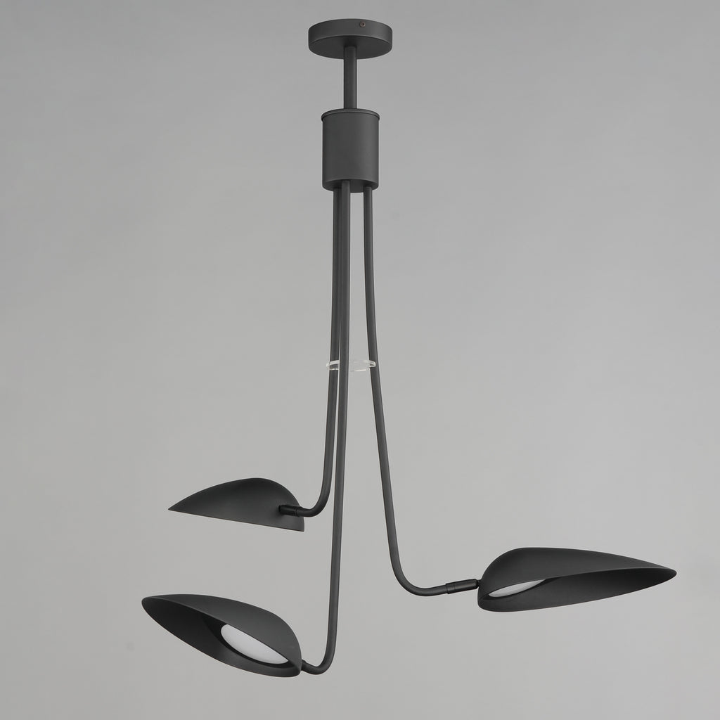 Drawing the outdoors in, the inspiration for this piece combines iconic modern lighting with biophilic forms. Long slender armatures descend in organic slopes to domed, ovoid shades that appear leaf-like. Finished in Matte Black the collection features coordinating low voltage garden lights that blend into outdoor spaces while providing useful illumination.