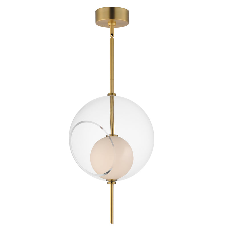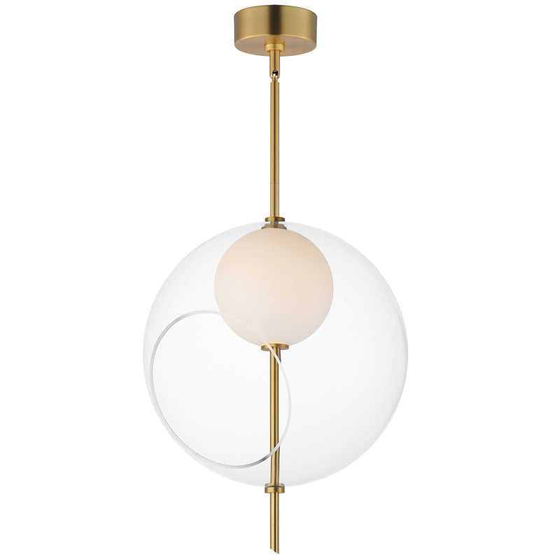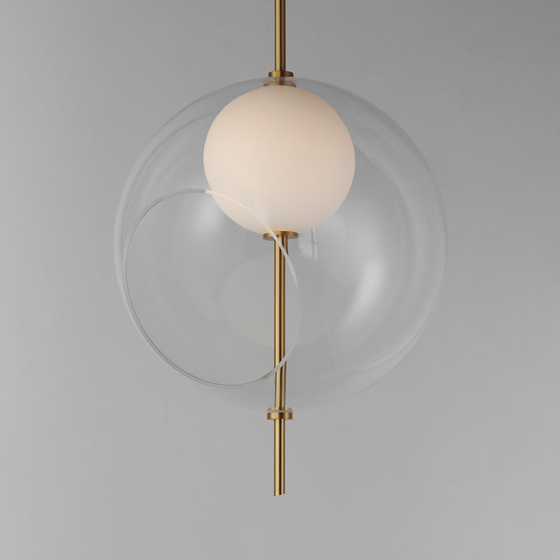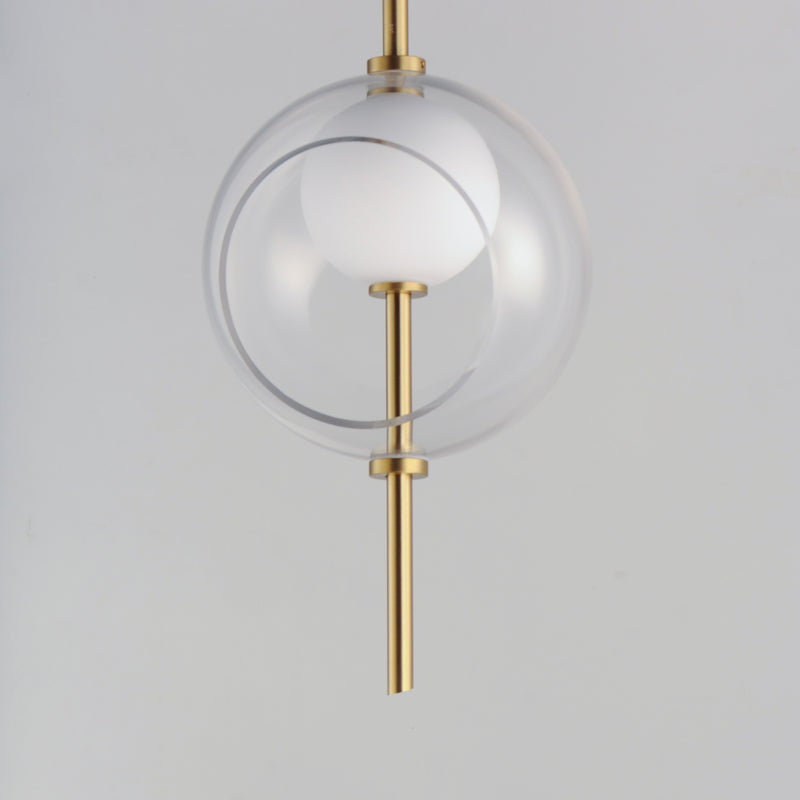 Class and character describe these unique LED light pendants. Start by taking a spike in Natural Aged Bass and stick it through multiple layers of glass globe shades. The outer layer is an oversized Clear glass with a slanted opening exposing a smaller White glass globe inside illuminated by the LED concealed within it. It's serving a martini and bright ideas.
