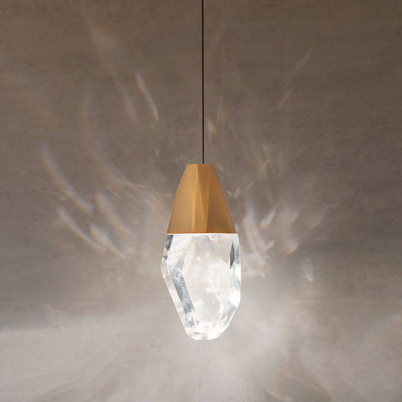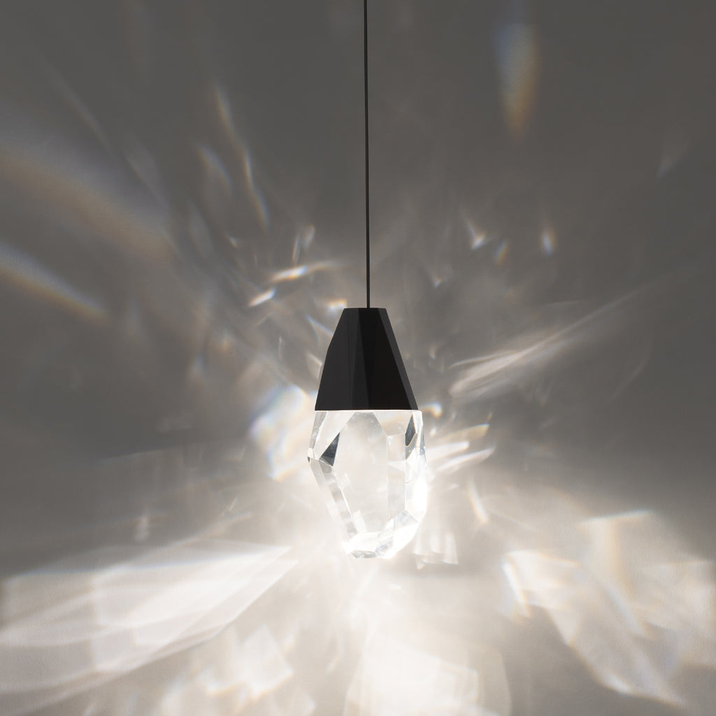 A shower of jewels. Suspended in mid-air, Schonbek Optic Crystal and Optic Haze Quartz elements composed of natural quartz gemstone illuminate at varying heights to entice. Cascading from above and perfectly designed to make a powerful yet elegant statement.