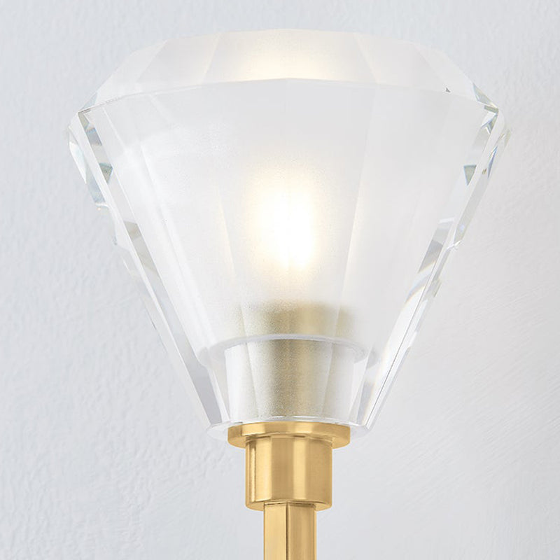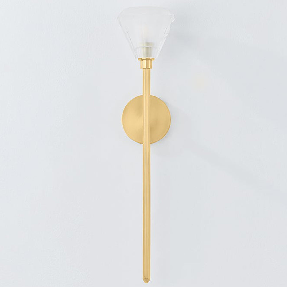 In the shape of a blooming flower, Maspeth features a gemlike K9 crystal shade and elongated ‘stem.’ Paired with the faceted crystal, the warm Aged Brass finish on the metalwork contributes a touch of vintage glamour. Tapering at the bottom, the square-shaped arm completes the fixture with a modern detail.
