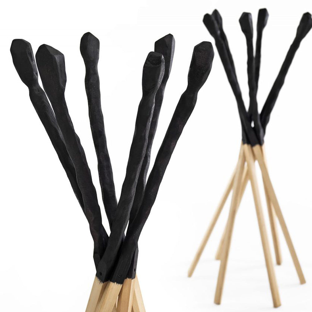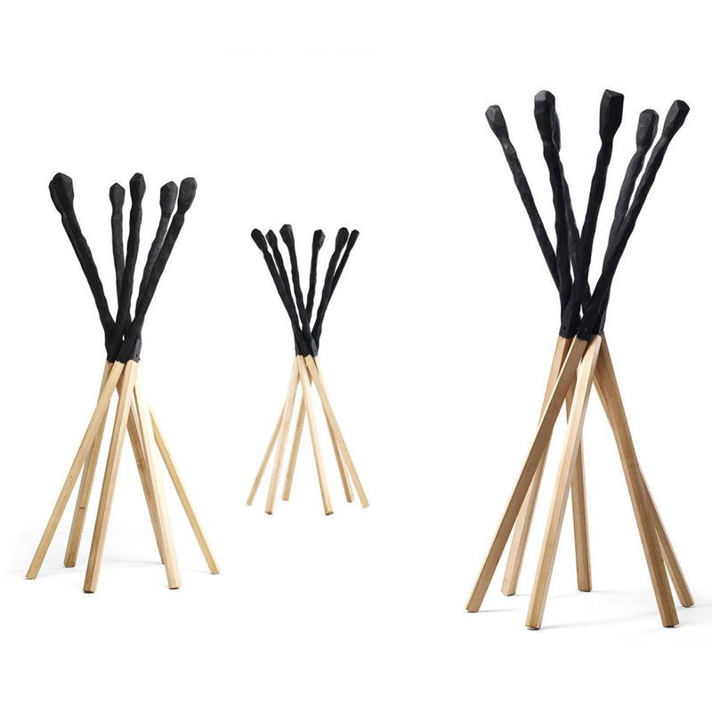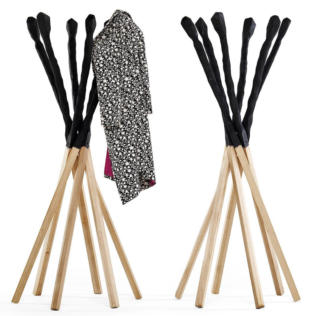 Match is a coat hanger in solid beech in black stained finish and natural oil. Match wants to remember the match consumed by the flame. Six wooden sticks joined together to compose a practical and ironic coat stand.