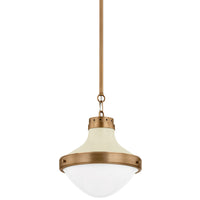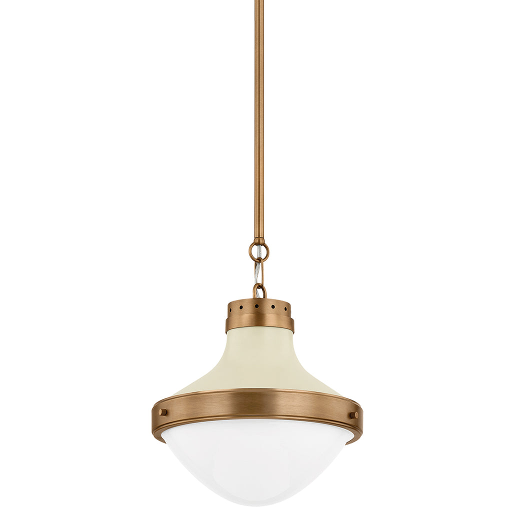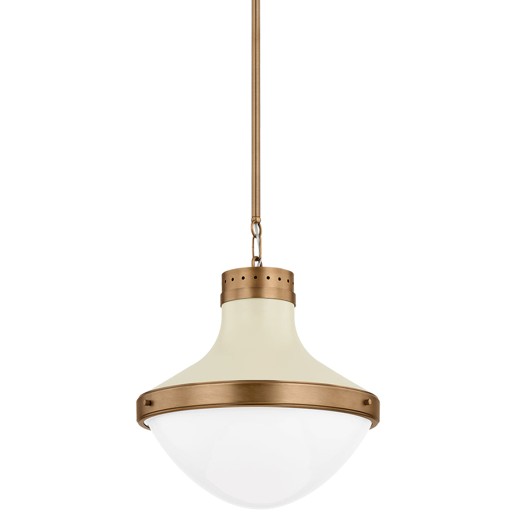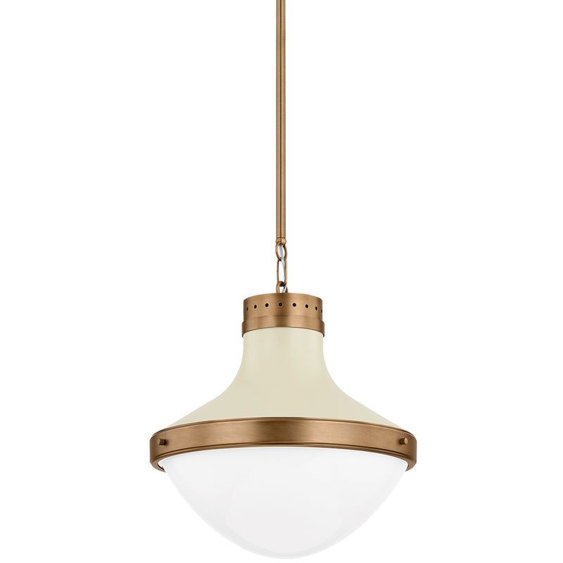 Mixed finishes and industrial details create dynamic contrasts in this elevated basic. A gently sloping Patina Brass and Soft Sand shade supports a rounded opal shiny glass diffuser. When the light filters through, the metalwork gleams with warmth. Available as a flush mount or a pendant in two sizes.