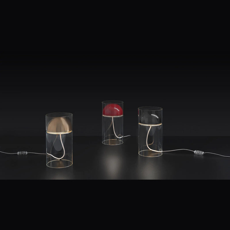 Medusa reverses the relationship between support and lampshade. The support does not uphold the lampshade but contains it. The dome, which houses the light source, is suspended in the cylinder by an elegant glass fold that allows a formal and refined cleanliness. The electric cable completes the design, descending freely from the centre of the diffuser and appears to sway due to reflections, giving a sense of lightness to the lamp. Formal cleanliness for a soft and warm light. Medusa is available in three colour variants: glossy black, satin gold, and scarlet red.