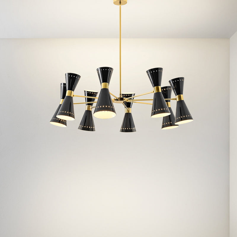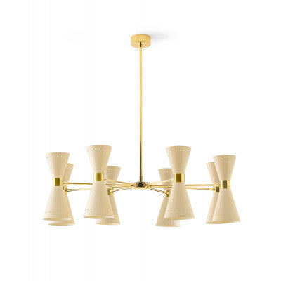 Megafono is an iconic 1950s lamp with both direct and indirect light. In the suspension version with three, six or eight arms, a prized brass structure bearing galvanic gilding combines with the directable double-cone lampshades in ivory or glossy black, illuminating the environment with elegance.