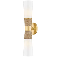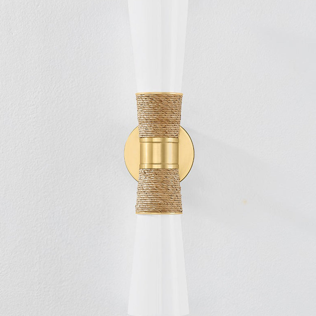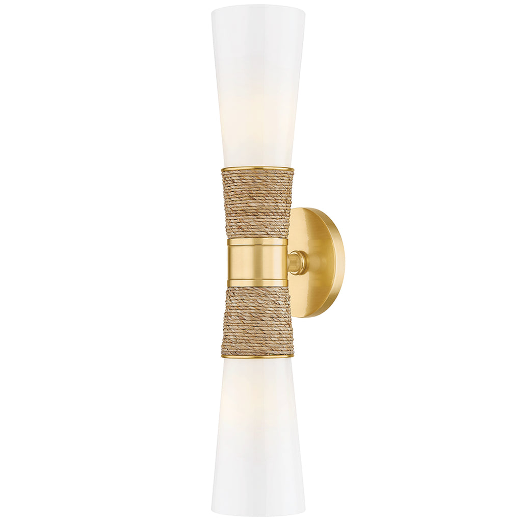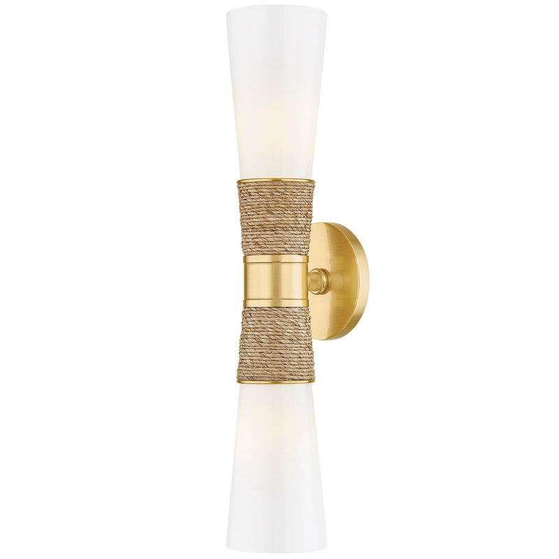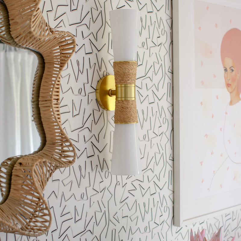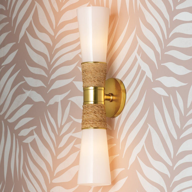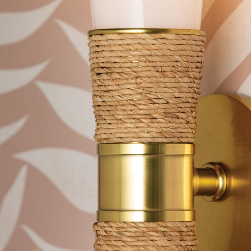 Balancing coastal charm with quiet luxury, Mica emits a gentle wash of light in kitchens and powder rooms. Its sleek silhouette is accented by wrapped raffia, an organic touch that makes this fixture feel approachable. An opal shiny glass shade diffuses light, which reflects off the Aged Brass metalwork. Mica is available as a pendant in two sizes, or a wall sconce with one or two shades. Part of our Megan Molten x Mitzi Tastemakers collection.