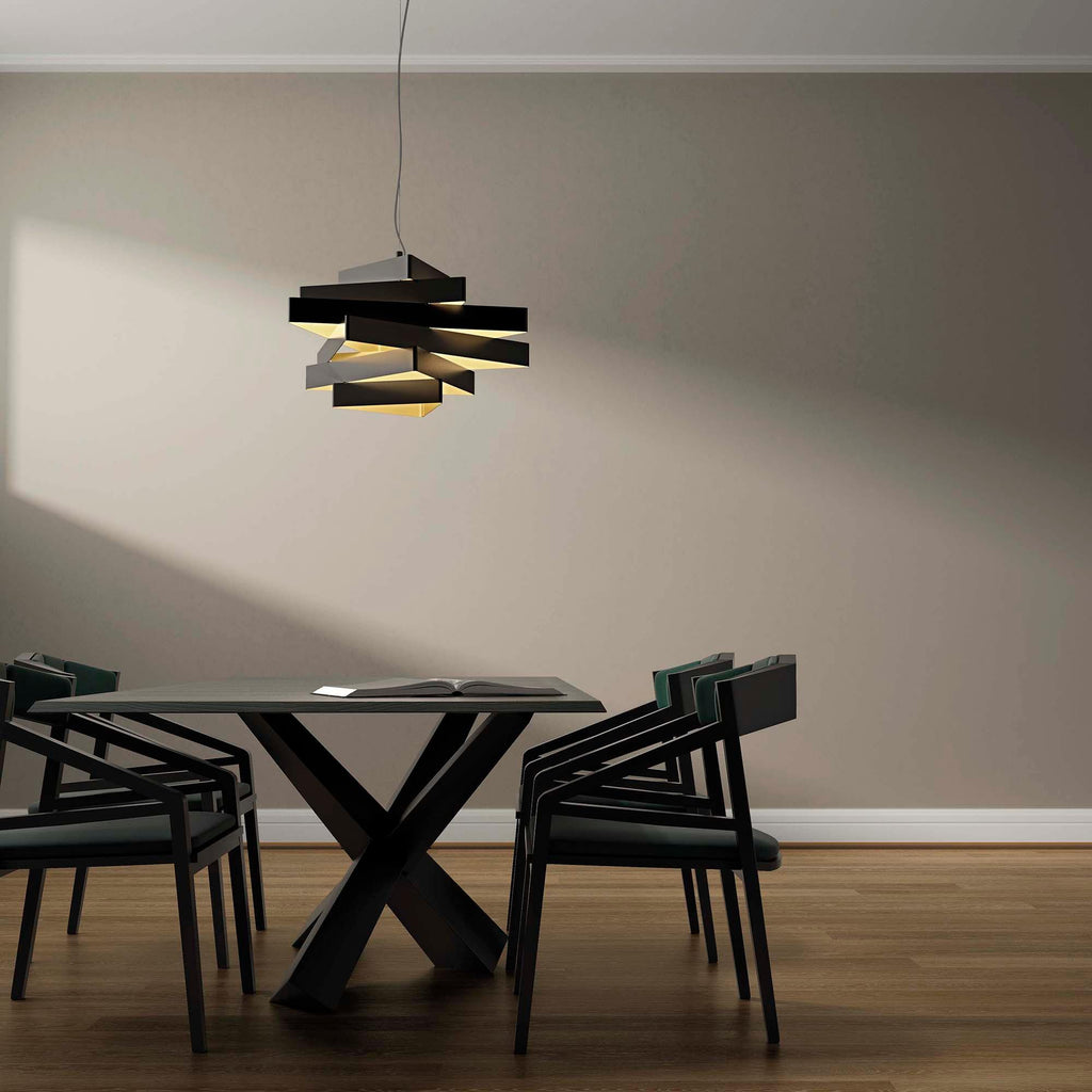 Featuring a sophisticated yet innovative light arrangement, Miles Suspension Light by Marchetti proves to be a great lighting option for people who are looking for a chic style lighting piece for their homes or offices. The suspension light boasts a stacked-up tile appearance with a halogen light source embedded within the grooves. Show your dynamic personality with this bespoke light fixture available in white, black, gold leaf, silver leaf paint surface finishes.