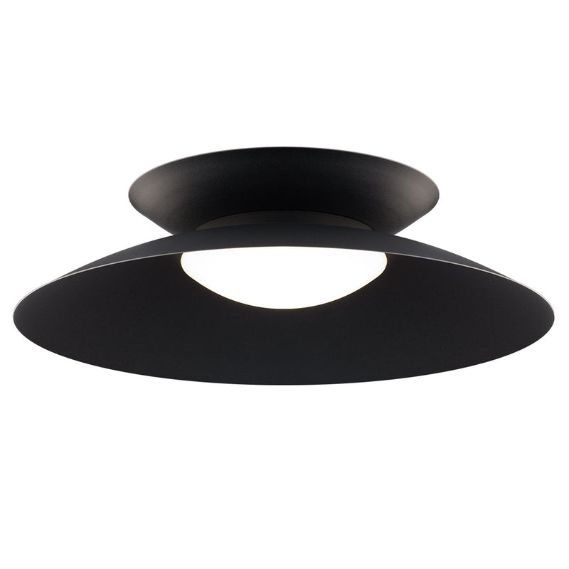 Go bold with a dramatic ceiling luminaire that is ideal for minimalist spaces. A black shade curves around a white diffuser, creating downward-directed illumination.