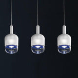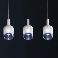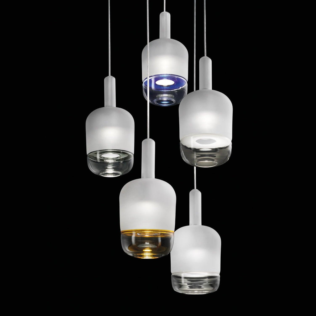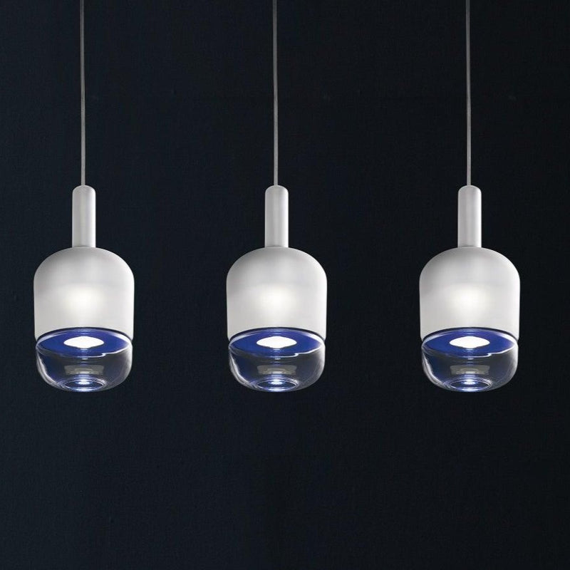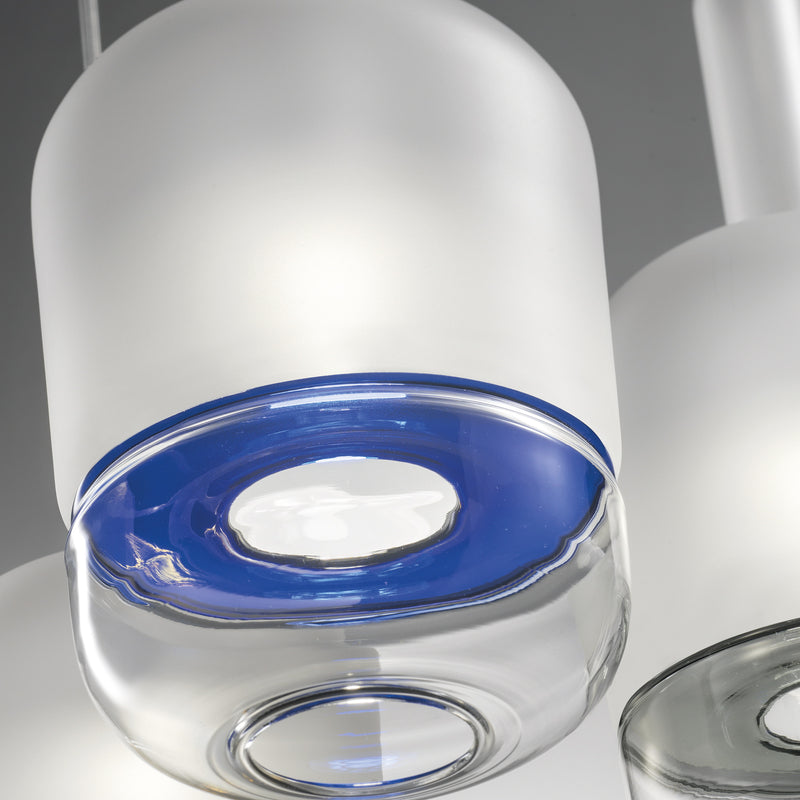 Pendant lamps in blown glass. The external part is partially sanded with an inner glass insert in white, blue, smokey and amber. Metallic components in chrome.