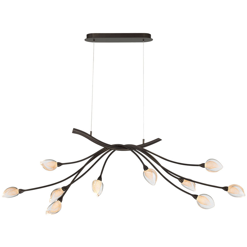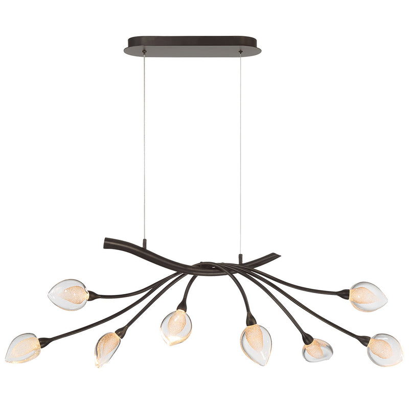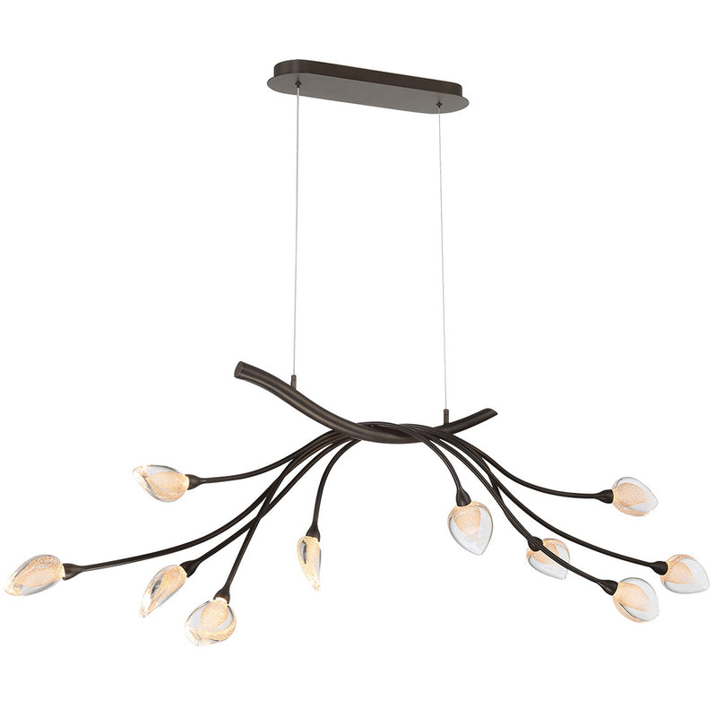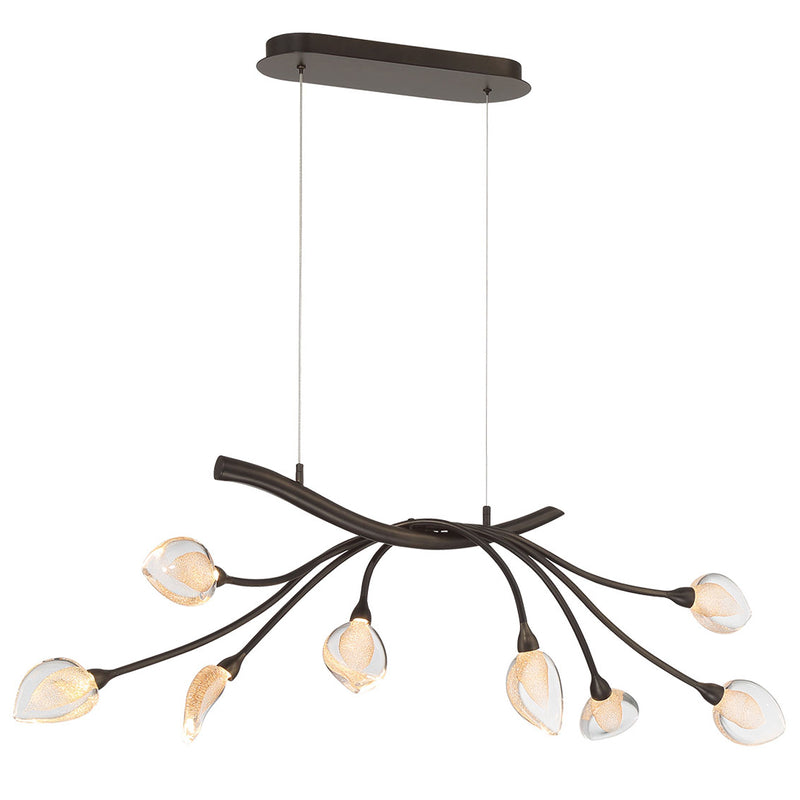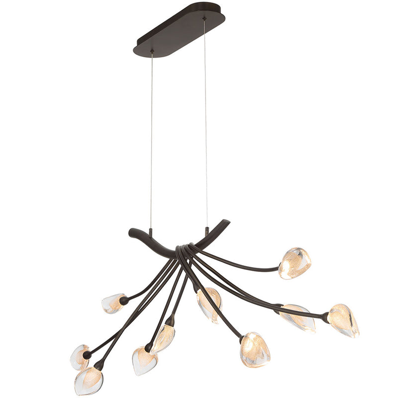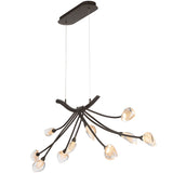 The handmade glass elements bring a distinctive touch of artistry and craftsmanship to the chandelier, elevating its aesthetic charm. The natural shape introduces an organic, fluid elegance, creating a visually captivating centerpiece. The bold black finish, complemented by natural gold accents, achieves a strikingly sleek and sophisticated style, perfect for contemporary interiors. Blending modern sophistication with timeless elegance, this fixture adds a refined touch of class to any room. The handmade glass elements are designed to diffuse light evenly, creating a warm and balanced illumination that enhances the ambiance of any space