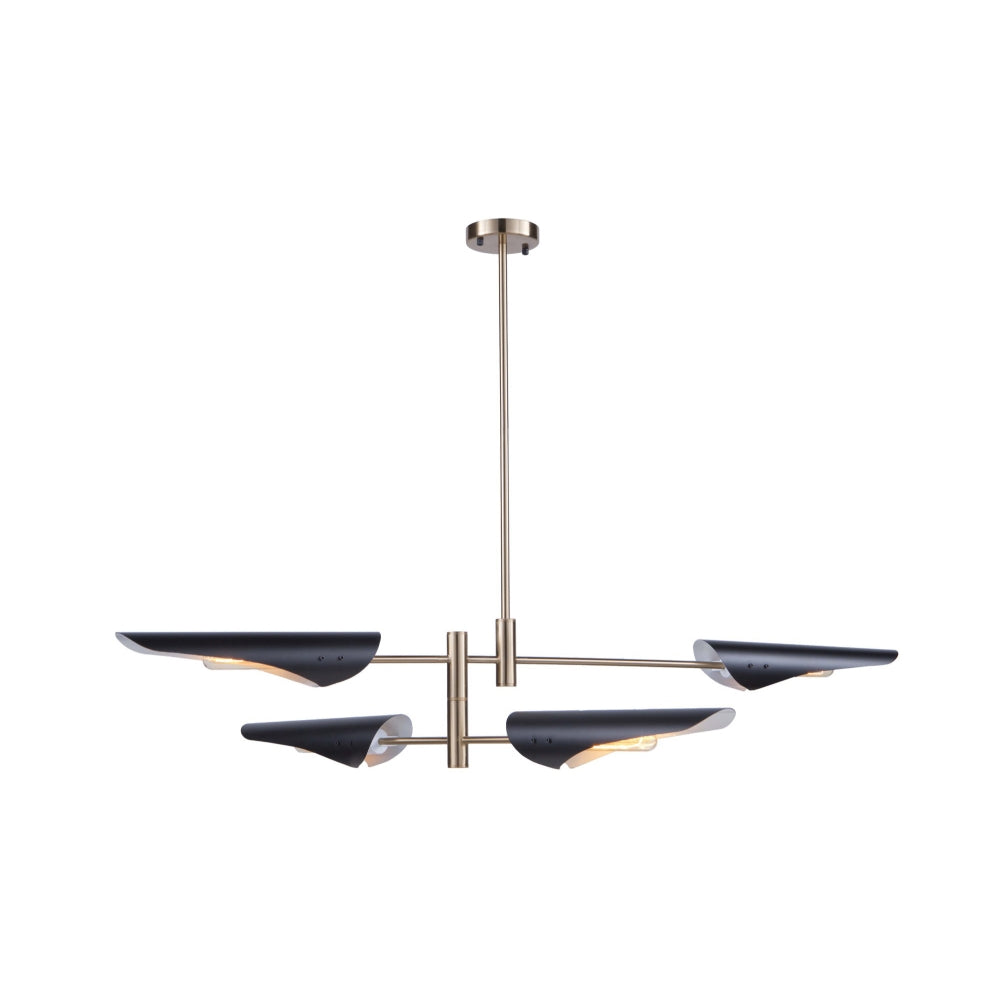 The Modern Renaissance collection is very stylish and trendy. The semi gloss black metal shades are painted in reflective white on the interior. The balance of the chandelier is plated in harvest brass. Multiple rods are included for desired height.