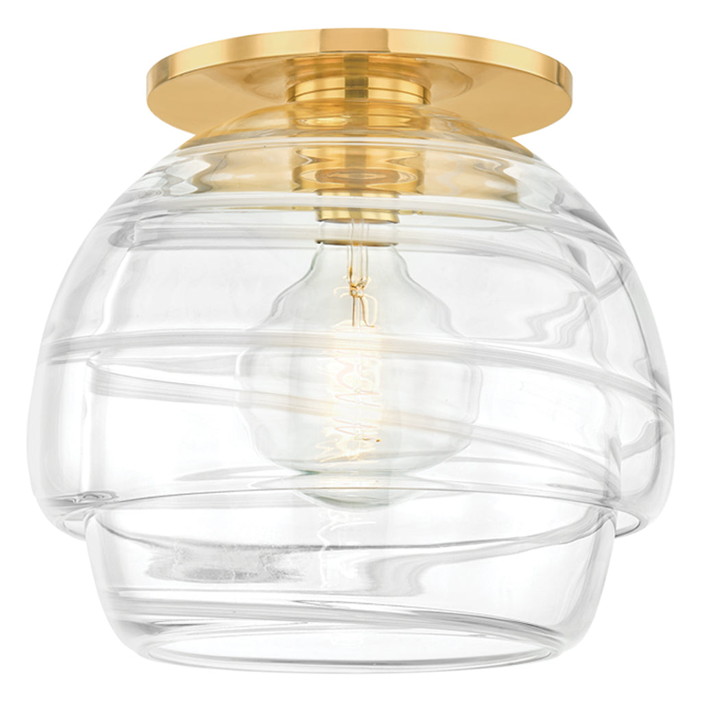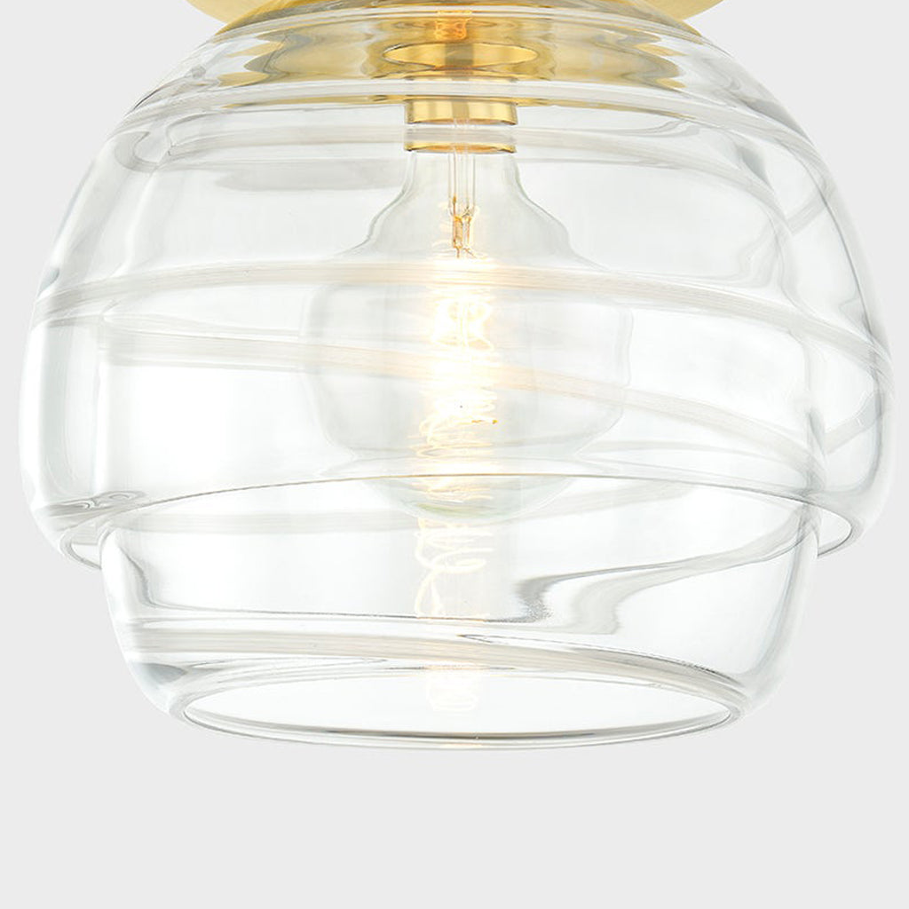 Made from distinctive Tourbillon Blanc glass, this elegant bubble-shaped flush mount is complemented by a sleek Aged Brass canopy. Characterized by its clarity and white swirl details, the unique glass enhances the organicism of this artistic design. With its contemporary appeal, Montvale effortlessly injects a fresh and modern ambiance into any interior space.