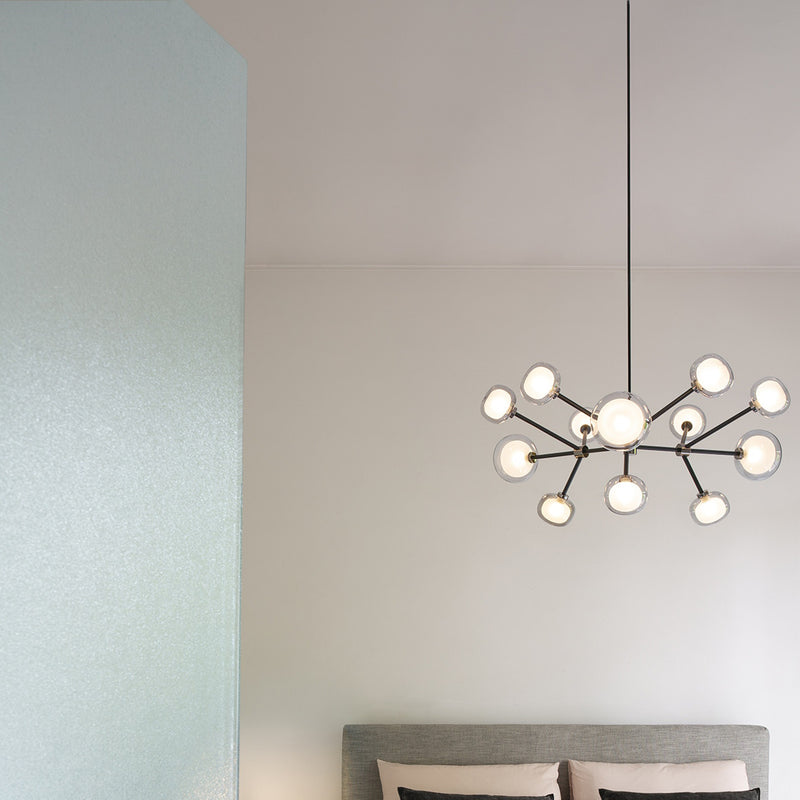 50s inspired collection of elegant and sophisticated lamps representing the detail to enrich any location. A double-sided spherical bright object in borosilicate glass makes these lamps available in different compositions and a structure made by metal coated with epoxy powder enriched with matte black brushed/brass or matte black/black chrome details. Different varieties are available for any situation: chandeliers (in five different models) or table lamp, bedside (smaller), floor or wall (available in three different models for single or composite personalized installation). Richness and sobriety all in one single element.
