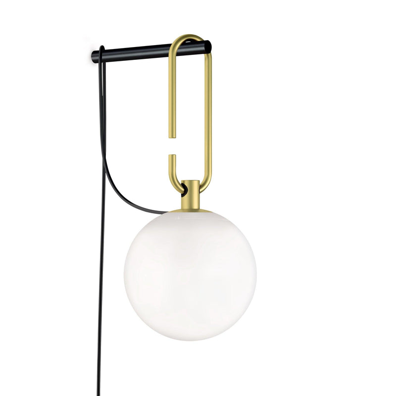 A white blown glass sphere slides along a brushed brass ring, which allows it to take different positions and to freely adjust and direct the diffuser. The frame becomes a support, a hook to hang the appliance to the wall, or a handle promoting an interaction with light. NH continues research on the dynamic interaction of experience, details, materials, form, and light that Neri&Hu are pursuing with Artemide.