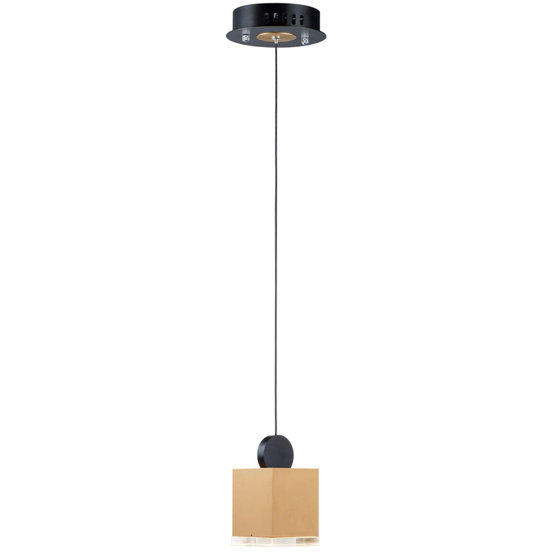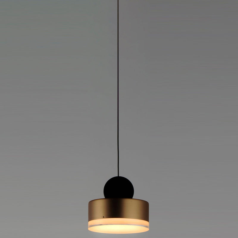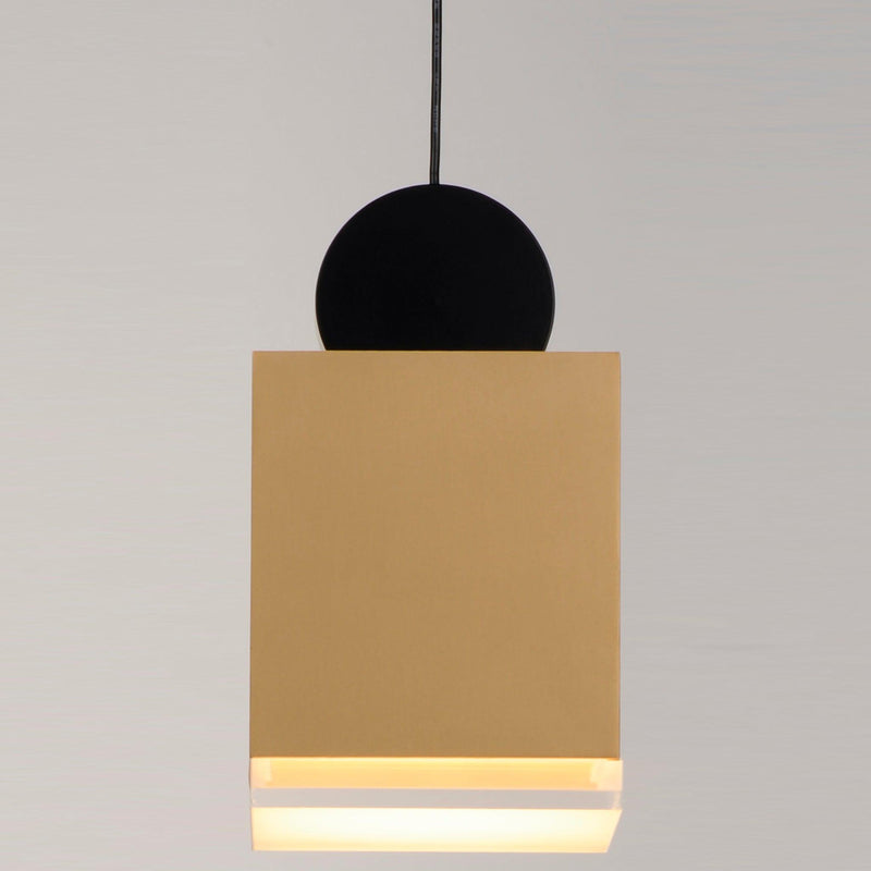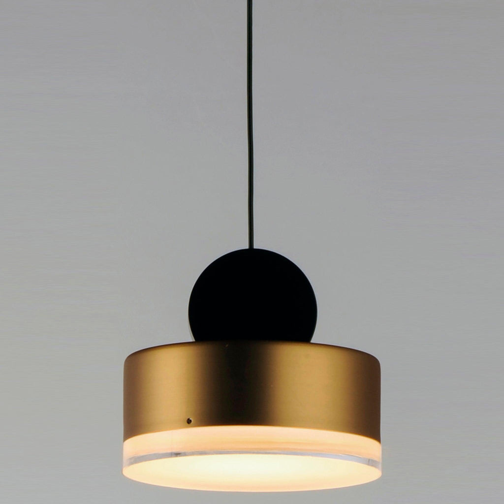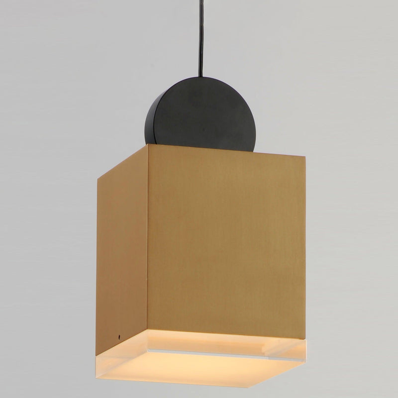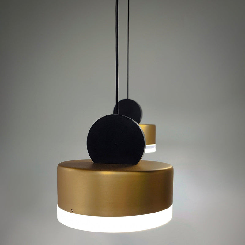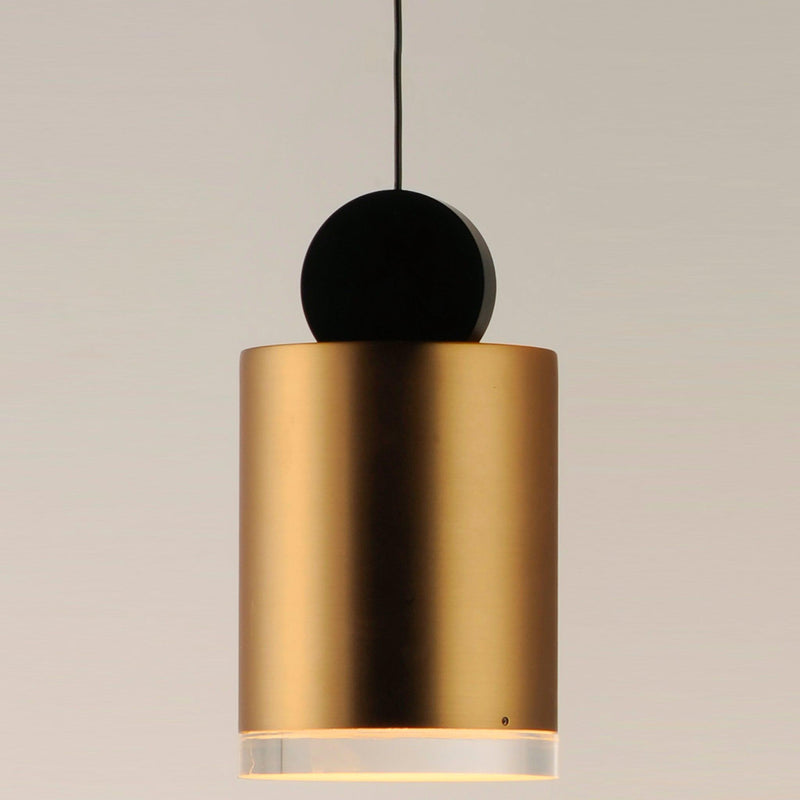 These geometric pendants can be arranged at various heights to create both a sculptural and functional form. Housings of plated Gold in various shapes and sizes are topped with a round handle of Black and finished on the bottom with a Clear acrylic diffuser.