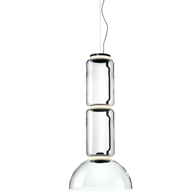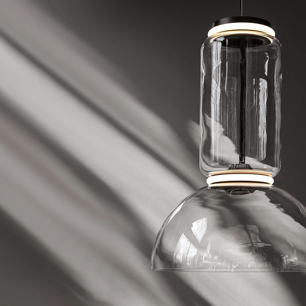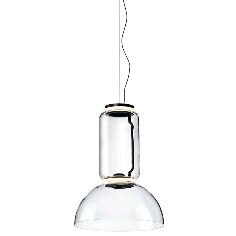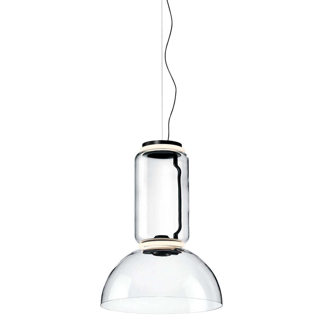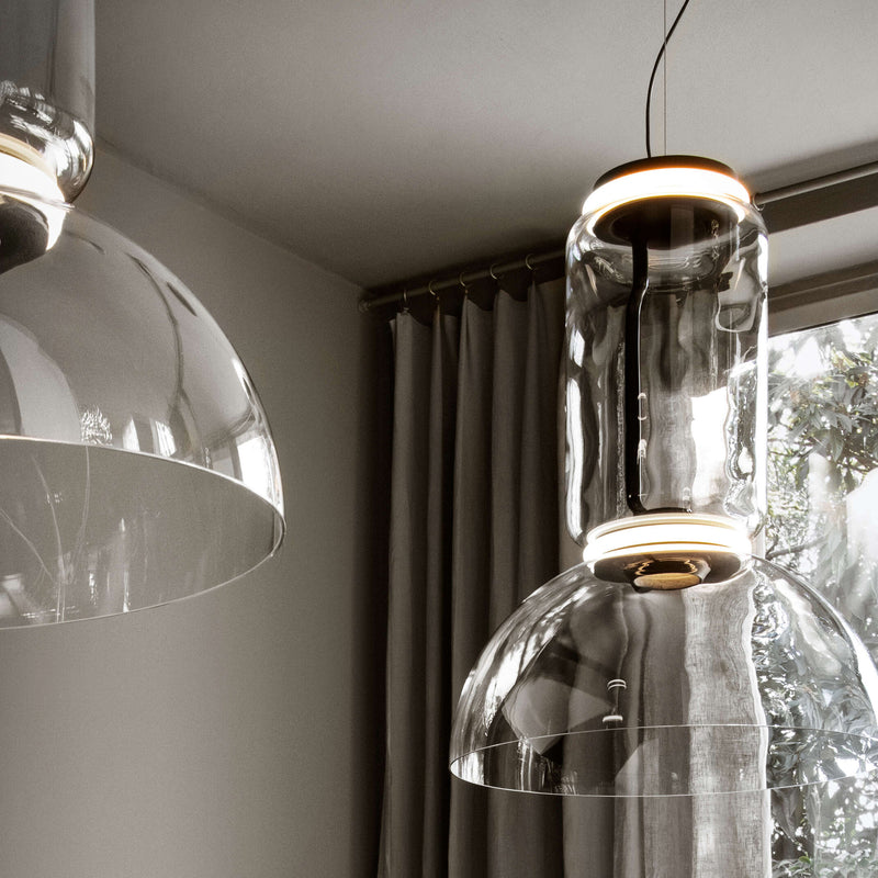 Noctambule LED dimmable pendant light with bowl shade, created by renowned designer Konstantin Grcic for FLOS, is an innovative lighting system that comes in an array of artful designs. A transparent hand-blown glass cylinder, surrounded on both top and bottom by discrete LED technology, is the foundation of this product. The fixtures built from these units form columns of light at varying heights that illuminate at the intersection between each module. Configurable as a hanging or standing lamp, Noctambule pendant lamp features additional components that allow for numerous options. The cylindrical body is available at a low and high height, and a dome- or cone-shaped head can be selected if a more direct light source is desired. Dimming capabilities can be configured in the power supply unit within the ceiling rose, or as a pedal panel on the power cord. Inspiration behind the design: Inspired by night owls, Noctambule features a transparent body that almost blends into a room when unlit, but makes its presence known when it illuminates at night. Discover the entire collection of this magical award winning collection of cylindrical LED dimmable modern lights.