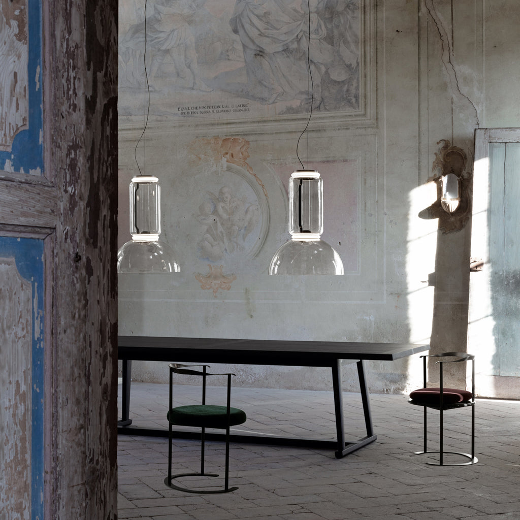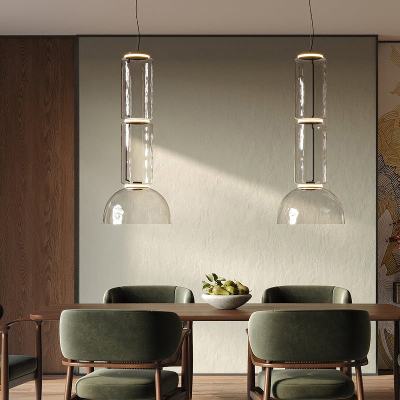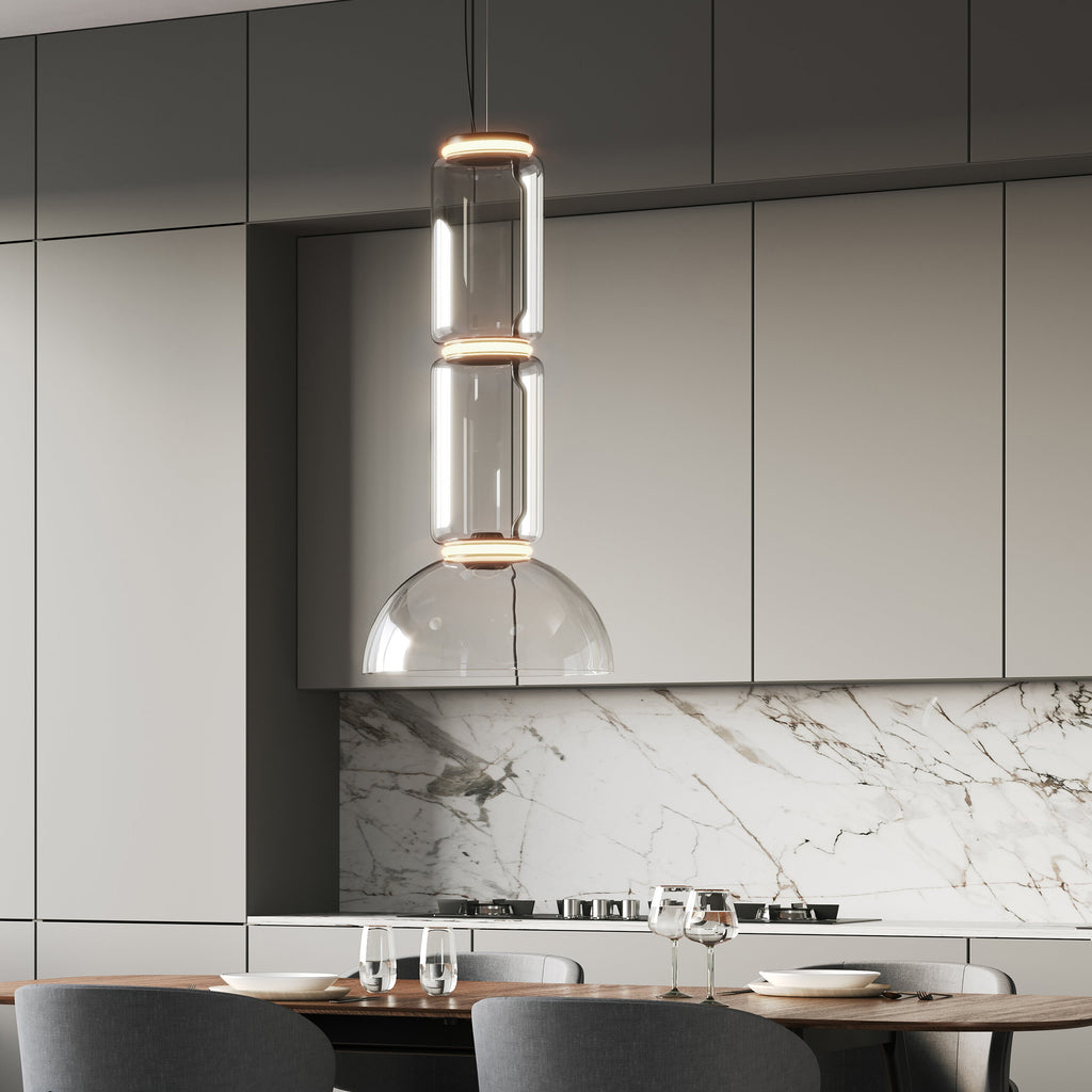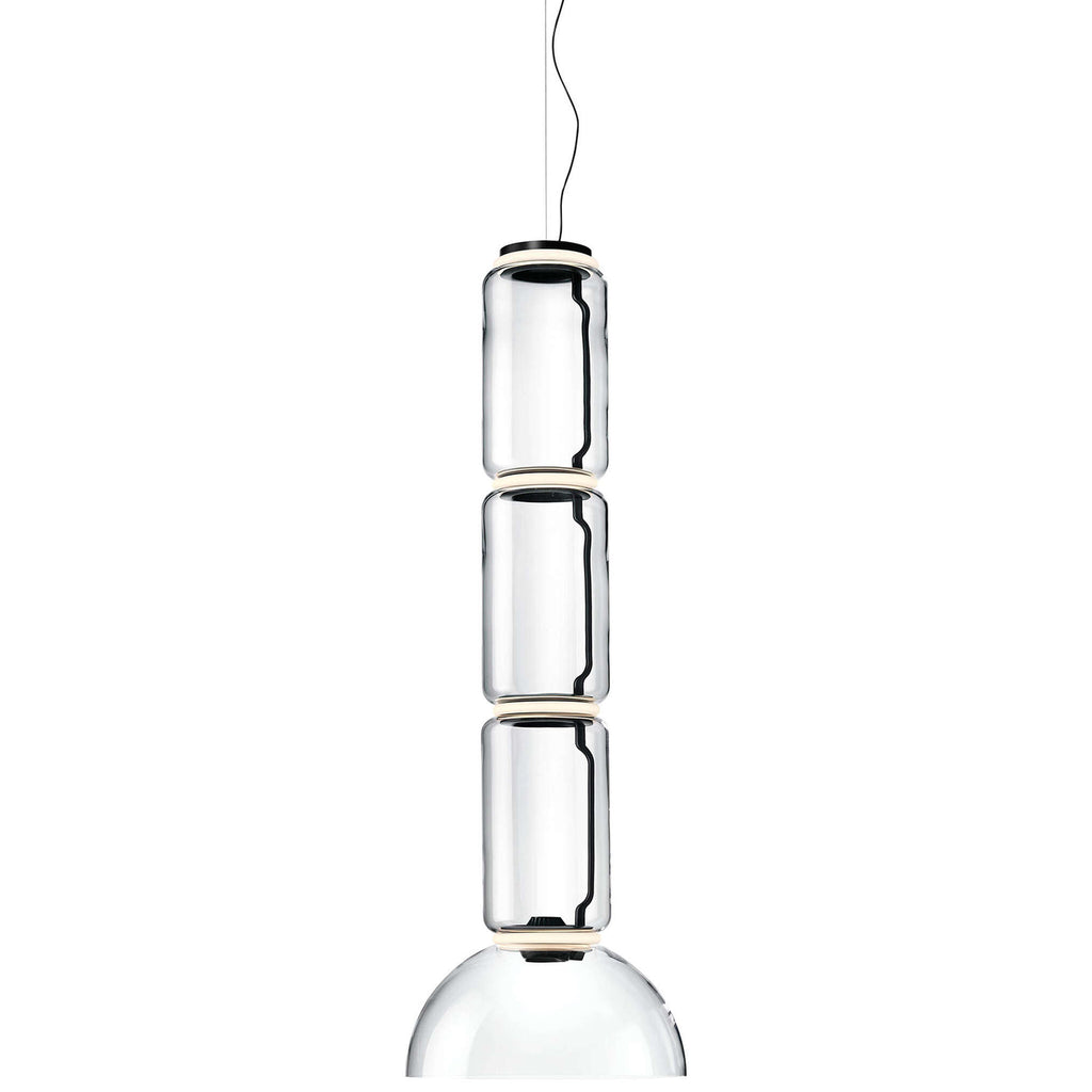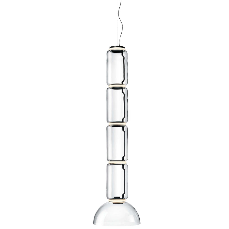 Noctambule LED dimmable pendant light with bowl shade, created by renowned designer Konstantin Grcic for FLOS, is an innovative lighting system that comes in an array of artful designs. A transparent hand-blown glass cylinder, surrounded on both top and bottom by discrete LED technology, is the foundation of this product. The fixtures built from these units form columns of light at varying heights that illuminate at the intersection between each module. Configurable as a hanging or standing lamp, Noctambule pendant lamp features additional components that allow for numerous options. The cylindrical body is available at a low and high height, and a dome- or cone-shaped head can be selected if a more direct light source is desired. Dimming capabilities can be configured in the power supply unit within the ceiling rose, or as a pedal panel on the power cord. Inspiration behind the design: Inspired by night owls, Noctambule features a transparent body that almost blends into a room when unlit, but makes its presence known when it illuminates at night. Discover the entire collection of this magical award winning collection of cylindrical LED dimmable modern lights.
