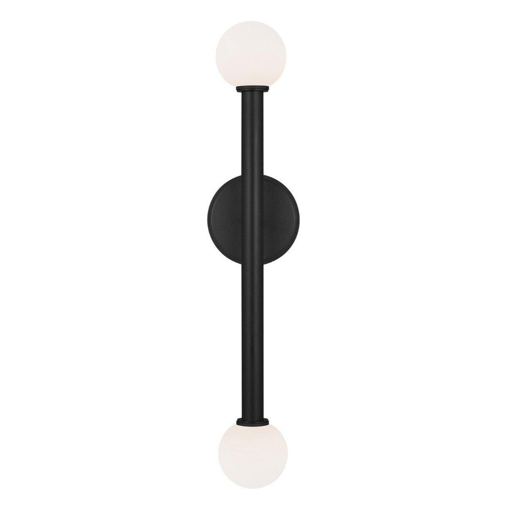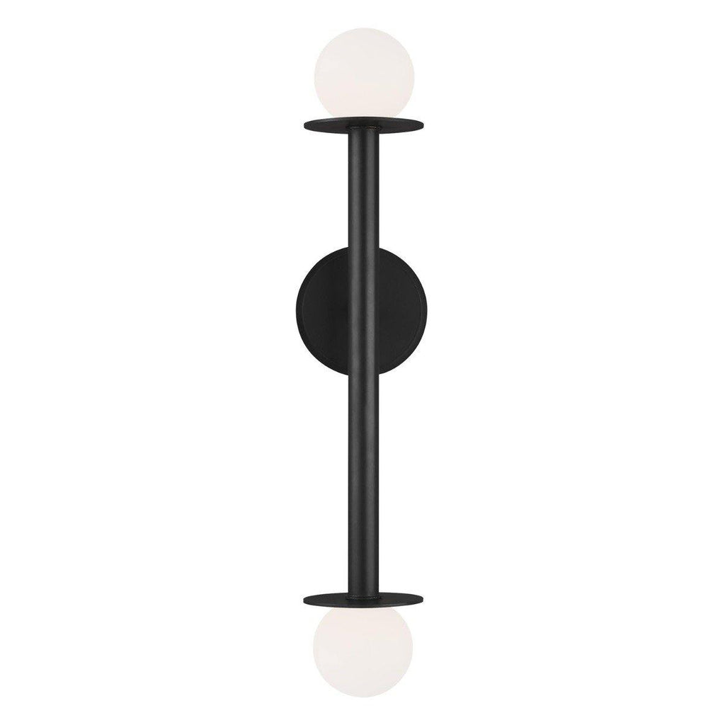 Switch out your nightstand lamp for Nodes 2 Light Wall Sconce by Kelly Wearstler . Not only does it lend a fashion-forward feel to your ensemble, but it also frees up space for displaying accents and keeping nighttime essentials on hand. Offer a touch of glam appeal to your walls with this one showcasing a curvilinear cast canopy fixed with milk glass globes on both ends. The linear rod canopy is offered in burnished brass or midnight black finishes. The halogen bulb helps both the orbs emit a heavenly glow.