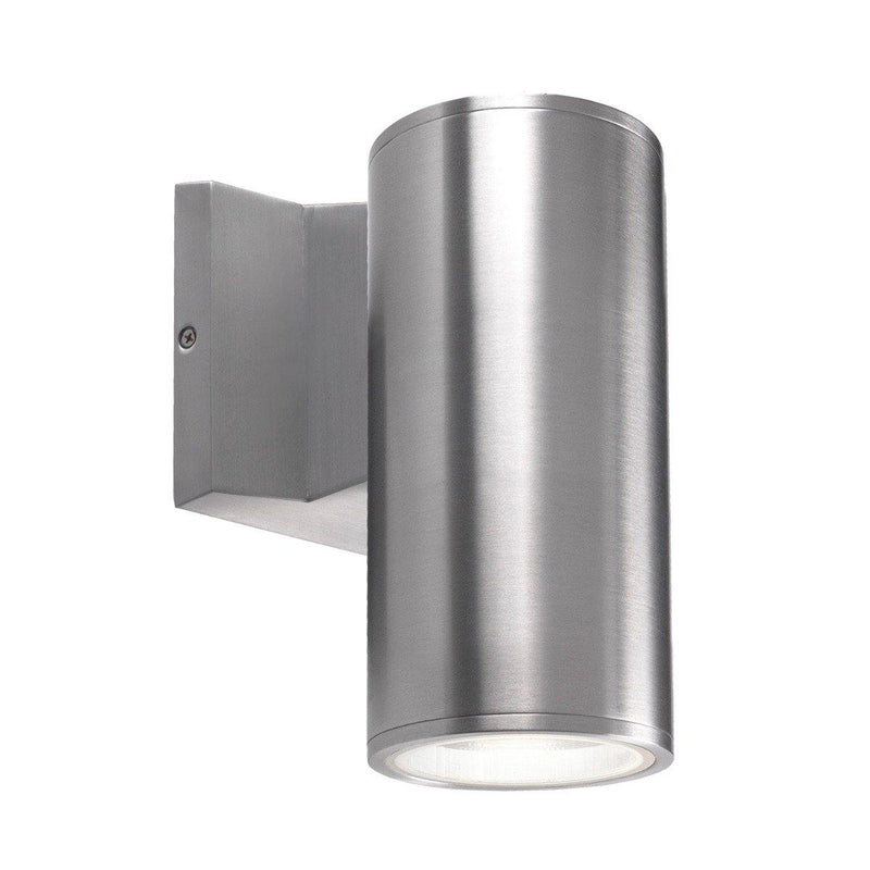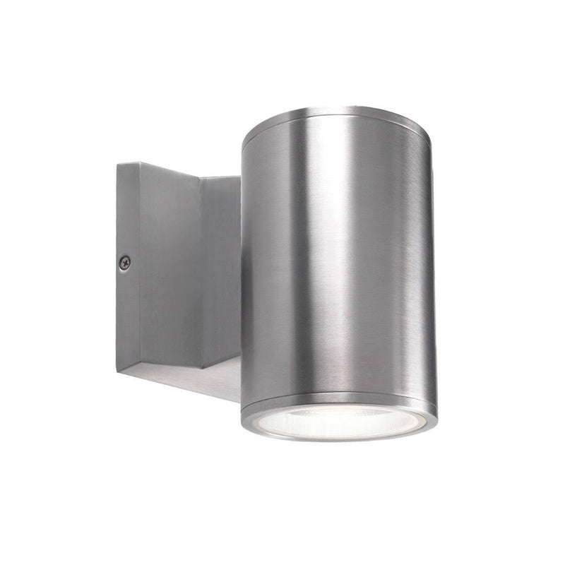 High powered LED exterior single light wall mount fixture, die-cast aluminum housing molded into a cylinder shape with in powder coated black or gray finishes. Concealed inside is our 120V AC LED technology with a tempered glass diffuser radiating light either upward or downward depending how it is mounted on the wall. Certified ETL wet location listed and is available in different sizes and two light options (see Lund family for details).