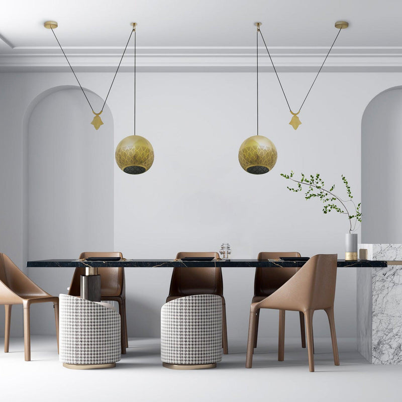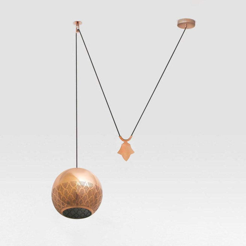 Nur Reversed ounterweight Pendant Light is luxurious Moroccan lighting at its best! It's our take on oriental and Moorish lamps. The intricate hand pierced pattern casts exquisite shadows onto the space and provides a focused light. The sphere shape provides the perfect canvas for the Darj W Ktef design.