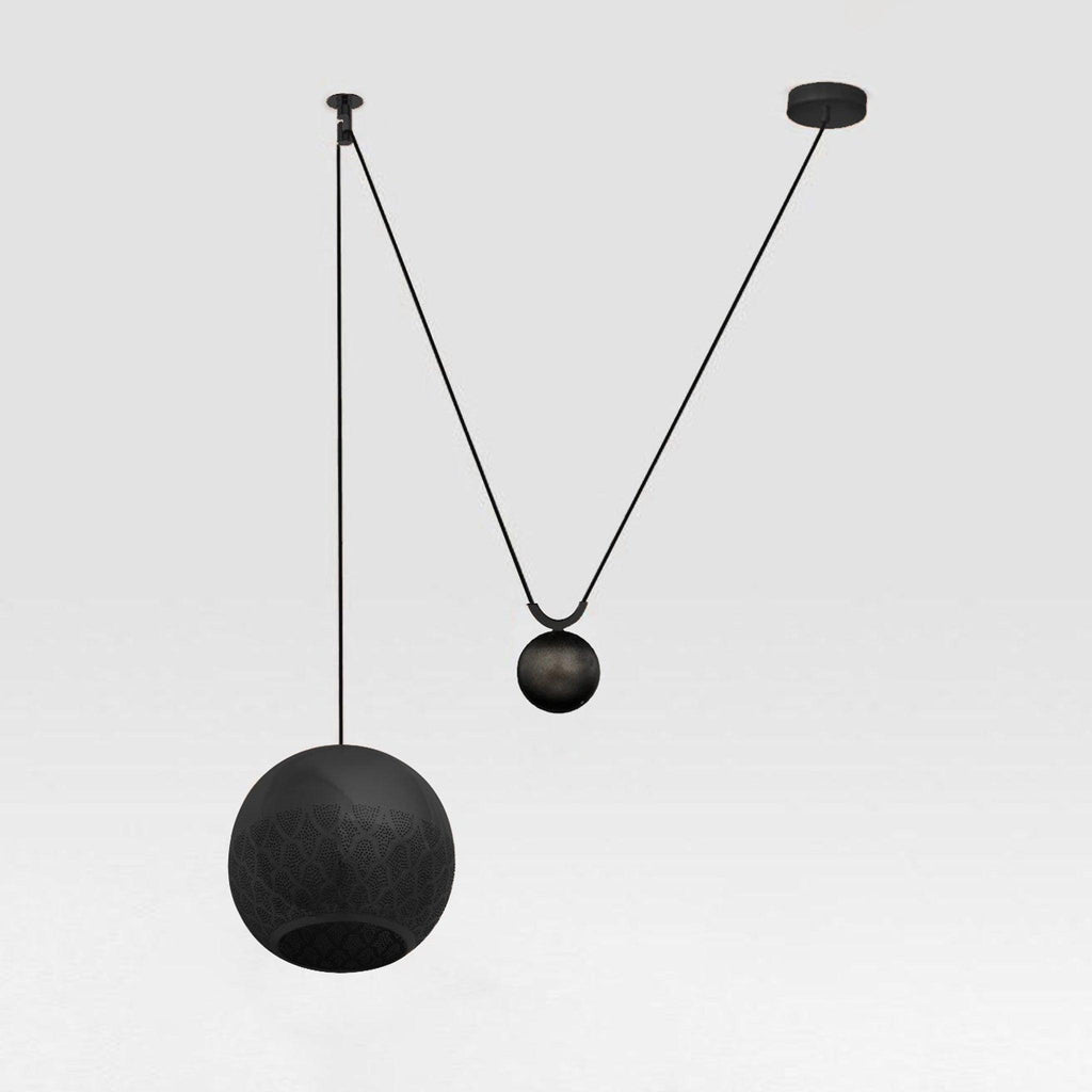 The counterbalance weight comes in the finish of your fixture. Choose between a solid sphere or a hamsa design to elevate your suspended fixture. the pendant is hung using a black cloth cord and a swag hook in the matching metal finish.