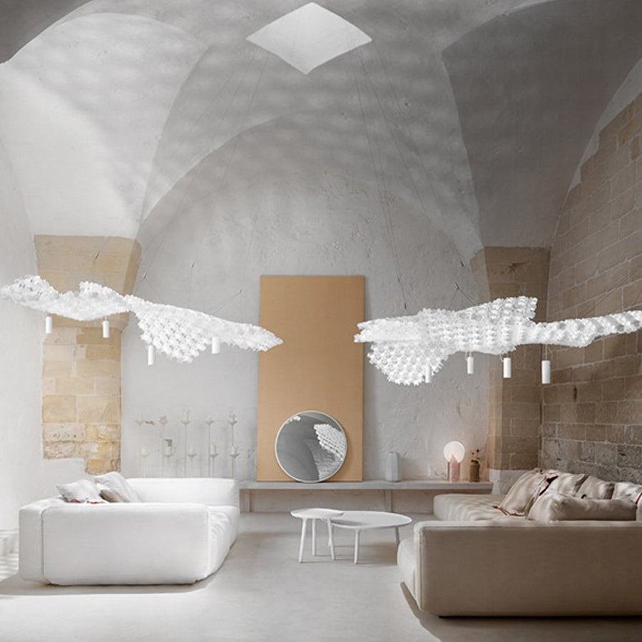Weightless and free…just like a cloud. Nuvem goes beyond traditional illumination, with agile anatomy that allows it to transform the architectural elements of a space, running across the ceiling and moving down the walls, creating an infinite sky. FLOOR MODEL.