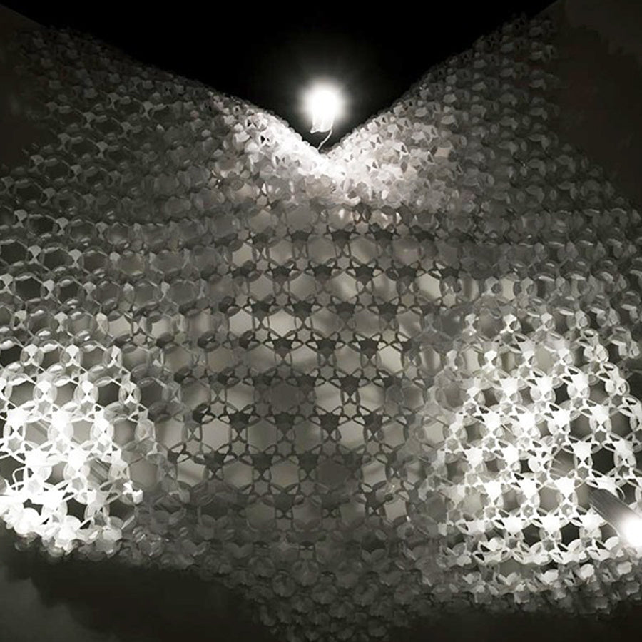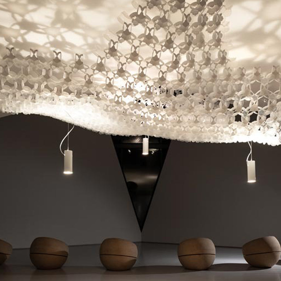 Nuvem’s lighting system is a series of bidirectional spotlights (one per square meter) that can be positioned above or below (threaded through the modules’ openings). Additional spotlights can be purchased separately for compositions that require amplified illumination.