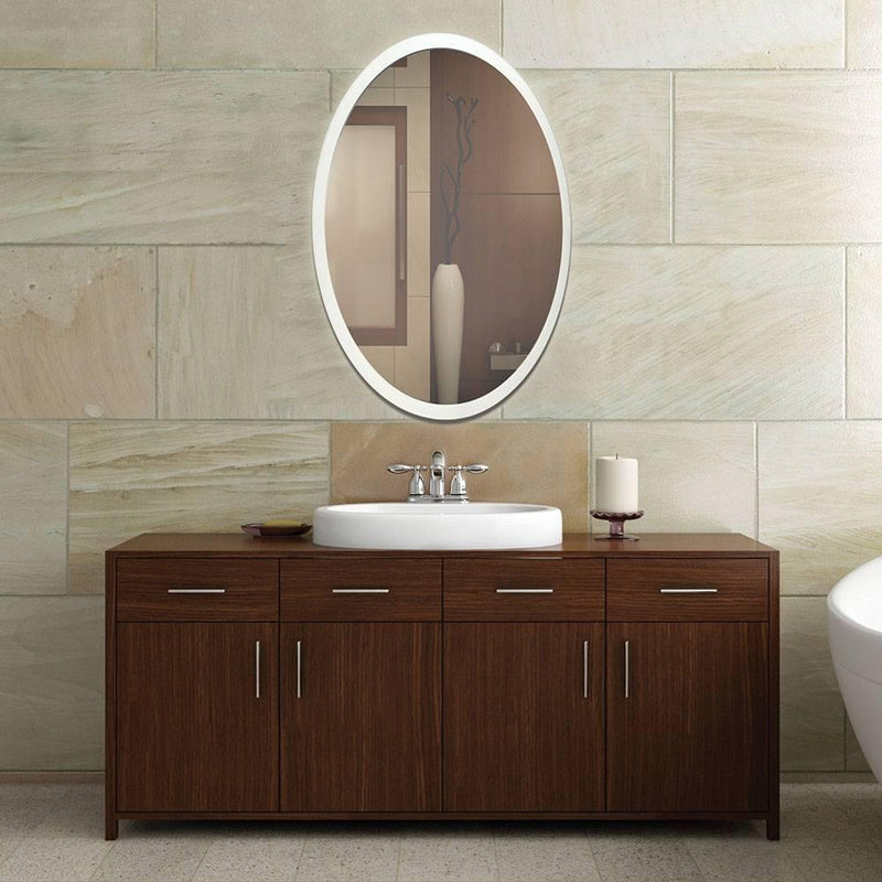 Create a modern setting in your house with the Oval Edge-Lit LED Mirror by Eurofase. Installed with a 31-Watt LED bulb, the mirror shines beautifully to grab visitors’ eyes. The illumination-intensity of the bulb used in this mirror can be adjusted thanks to its dimmable feature. It is a perfect piece of attraction for your bathroom or bedroom as it serves both as a utilitarian and a mild light source.