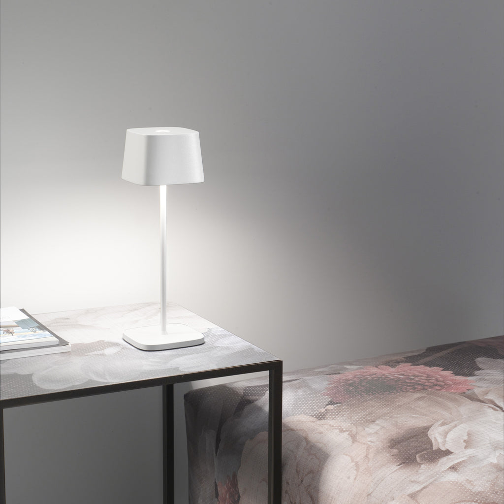 Ofelia Pro is a collection of rechargeable, battery-powered cordless lamps, now available in two sizes: the classic Pro and a brand-new Micro model. Features touch on/off, dimming, and 3-CCT color temperature selection for 2200K (candlelight), 2700K (warm white), and 3000K (cool white). The Ofelia Pro collection is equipped with a memory function which retains the light level and color temperature to the most recent setting each time it is switched off and on. Ofelia Pro lamps are suitable for both indoor and outdoor use (except for metallic finishes)
