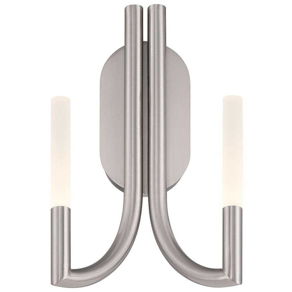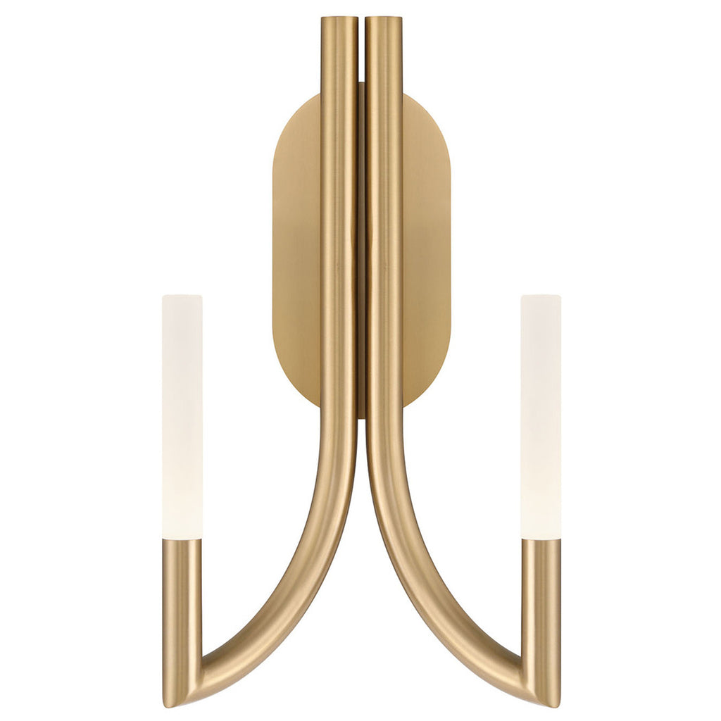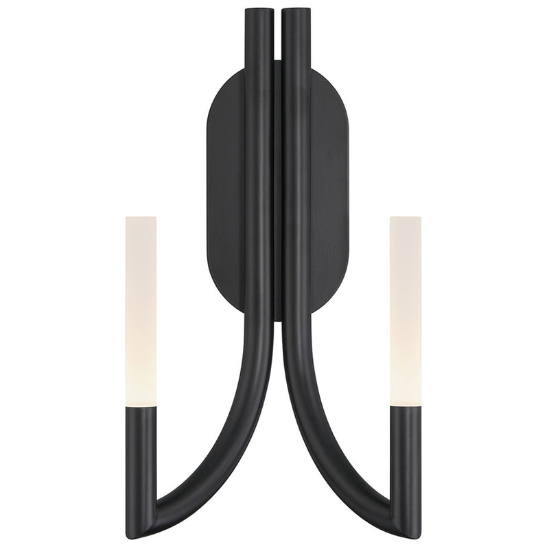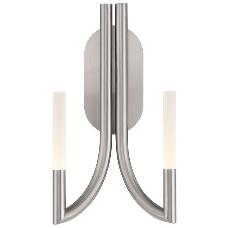 Refined curves and balanced symmetry define this modern sconce, offering a sleek reinterpretation of a classic silhouette. The smooth bends of the metallic arms gracefully frame the glowing diffusers, creating a warm, ambient light that enhances any space with understated elegance and sophistication.