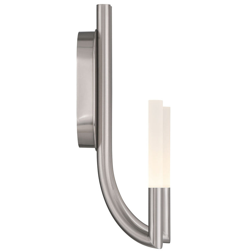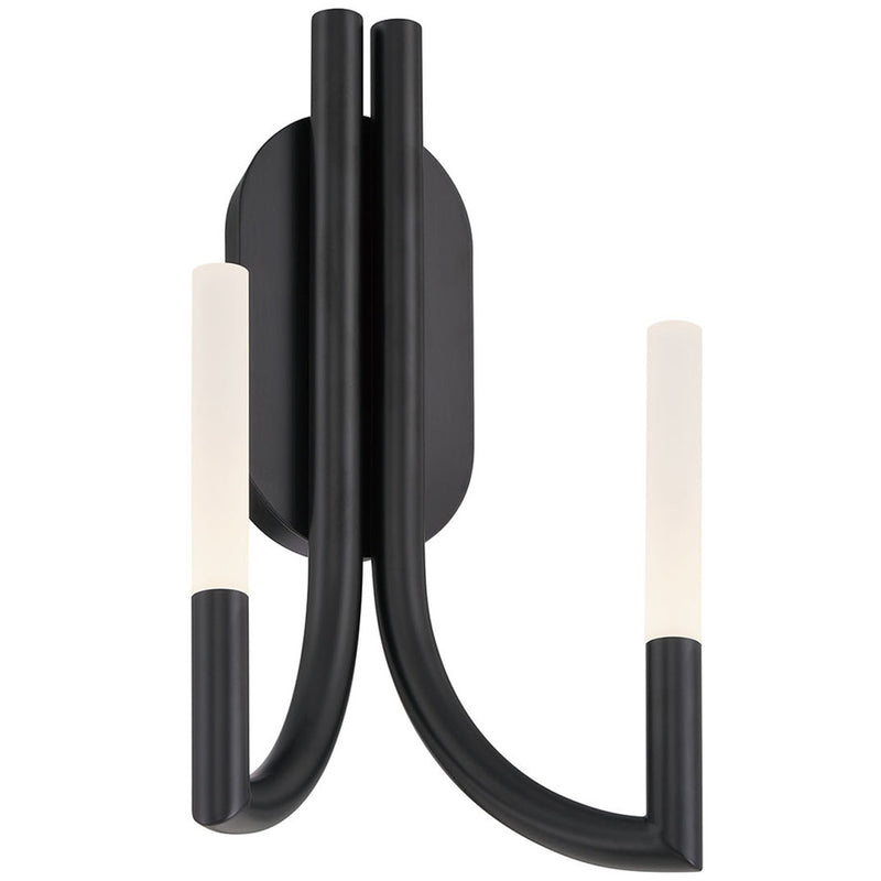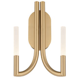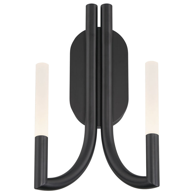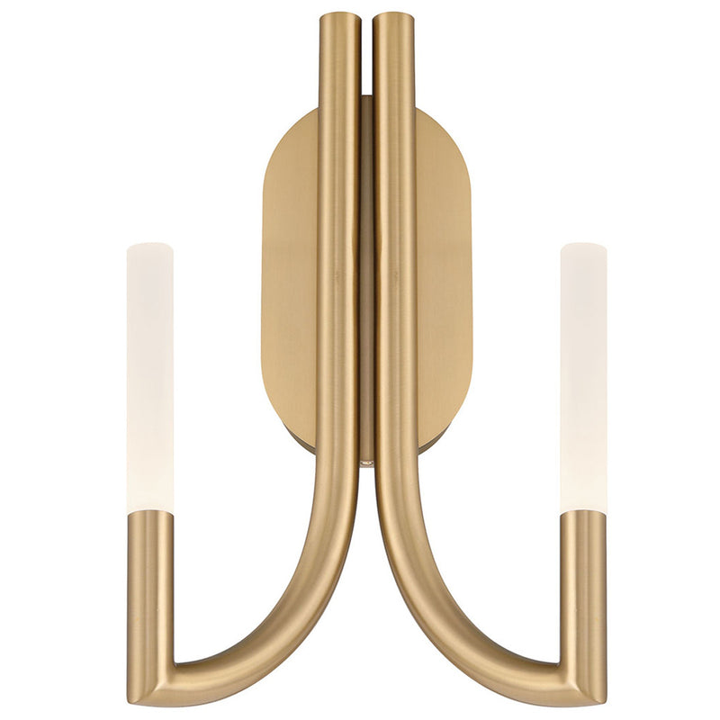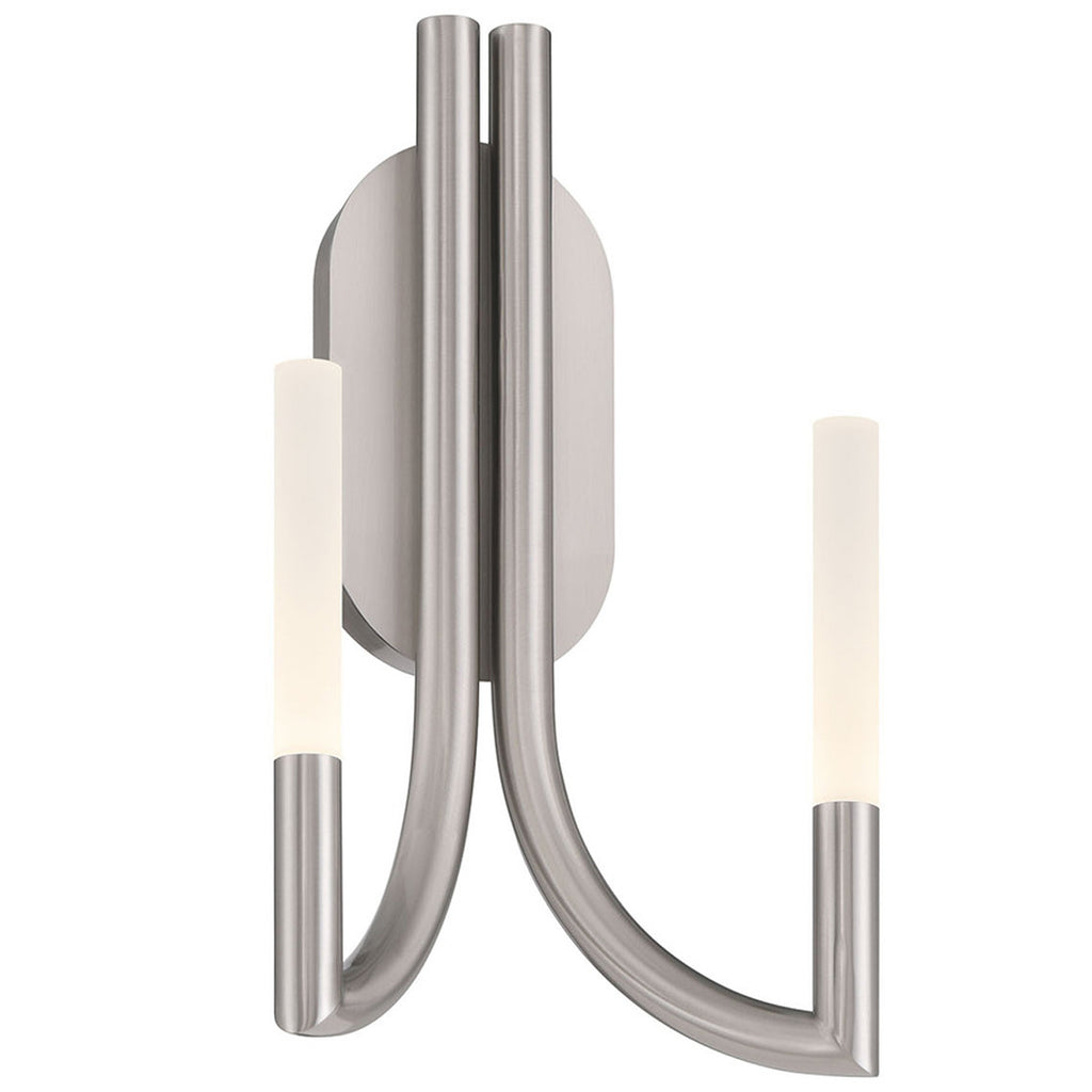 Refined curves and balanced symmetry define this modern sconce, offering a sleek reinterpretation of a classic silhouette. The smooth bends of the metallic arms gracefully frame the glowing diffusers, creating a warm, ambient light that enhances any space with understated elegance and sophistication.