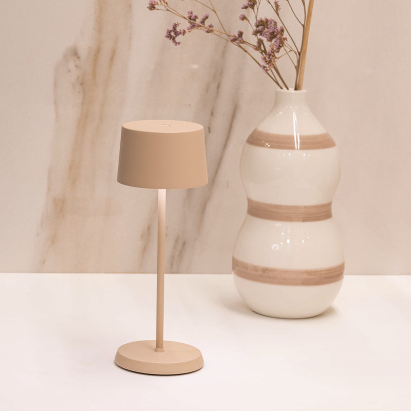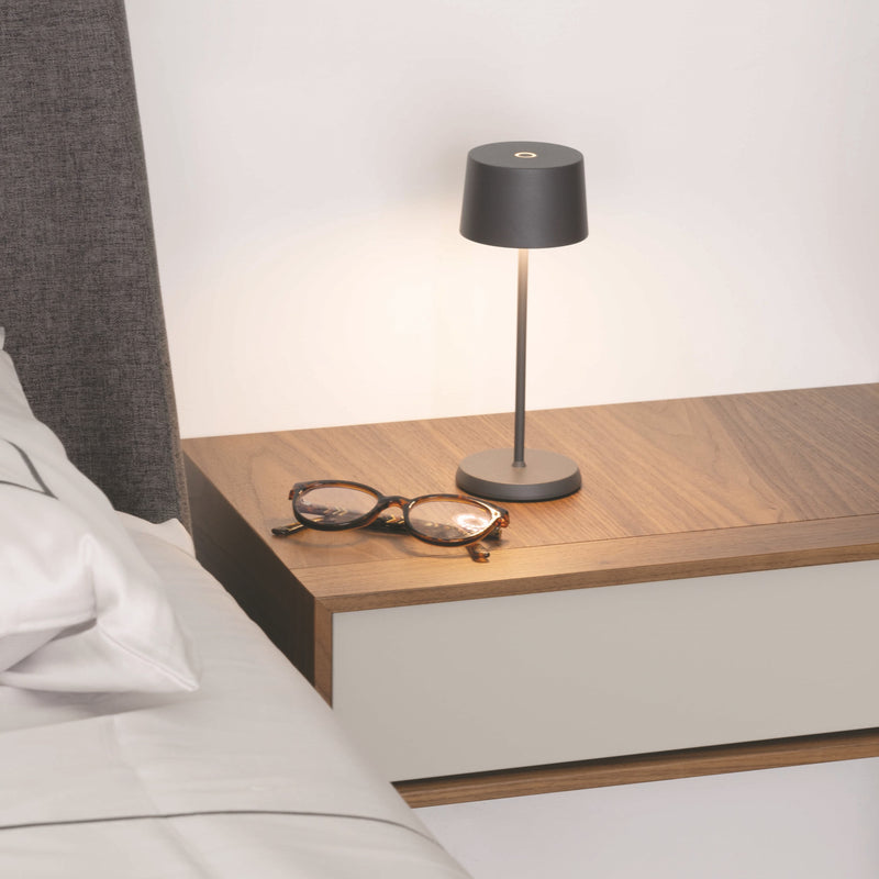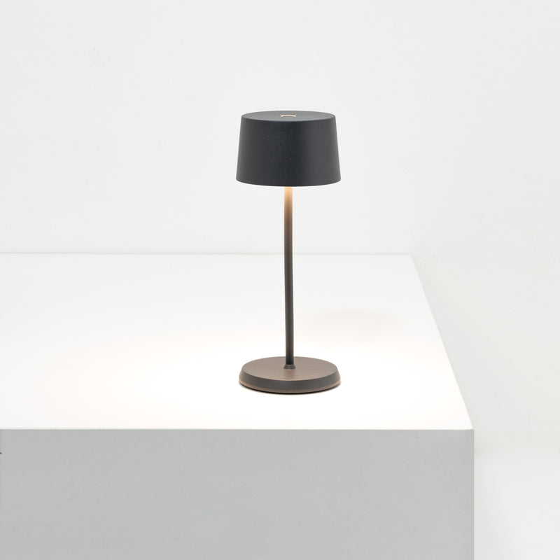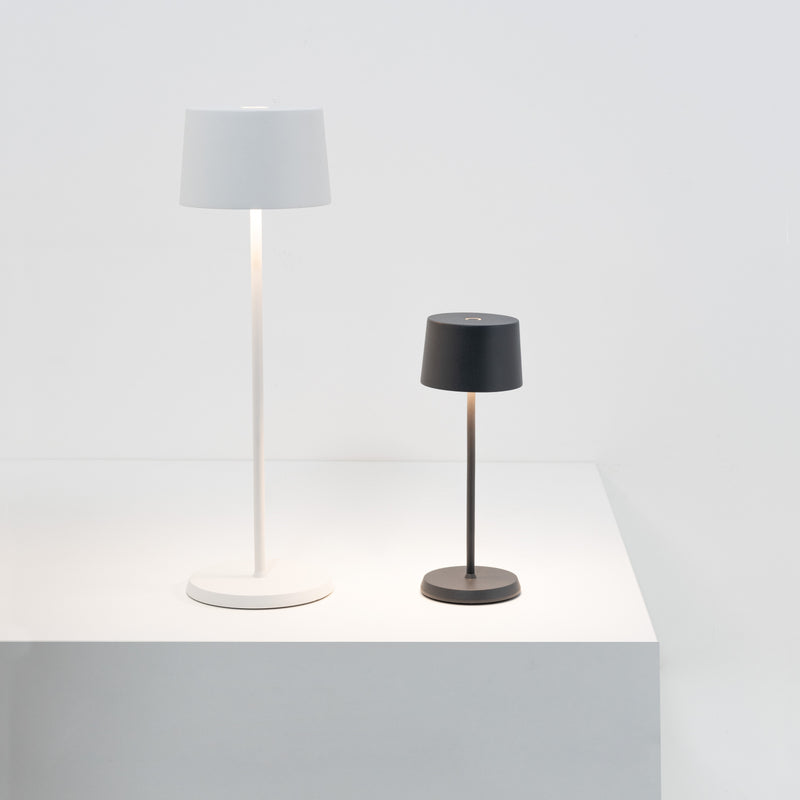 Olivia Pro is a collection of rechargeable, battery-powered cordless lamps, now available in three sizes: the classic Pro, Mini, and the brand-new Micro model. Features touch on/off, dimming, and 3-CCT color temperature selection for 2200K (candlelight), 2700K (warm white), and 3000K (cool white). The Olivia Pro collection is equipped with a memory function which retains the light level and color temperature to the most recent setting each time it is switched off and on. Olivia lamps are suitable for both indoor and outdoor use (except for metallic finishes)