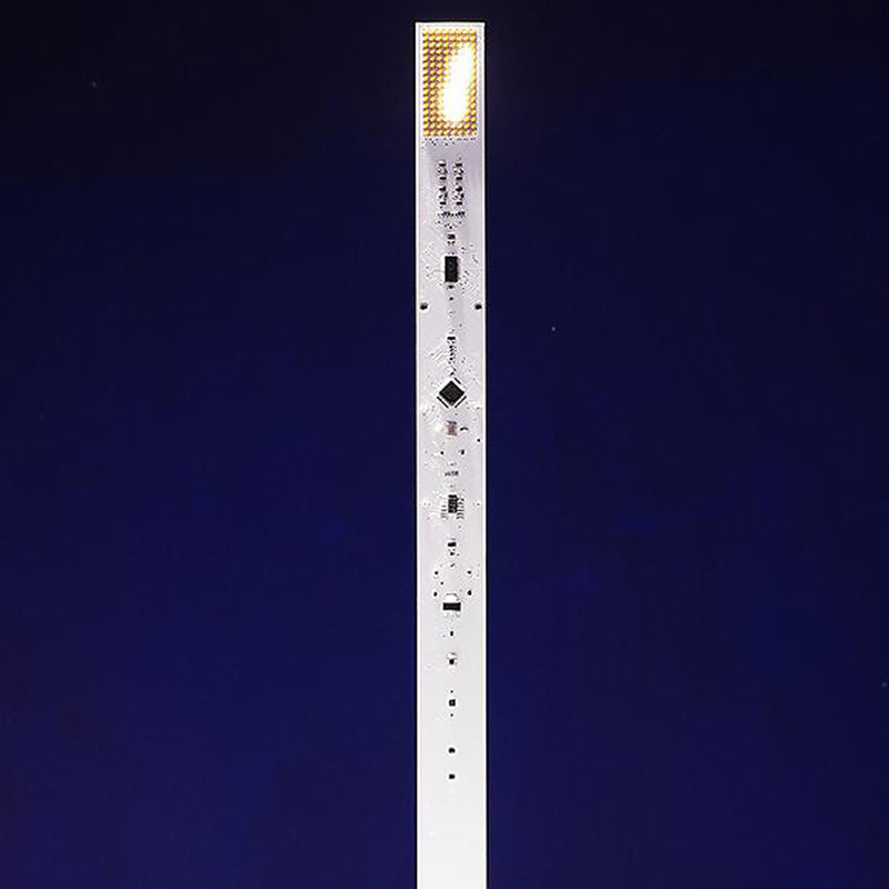 At the upper end of a sleek circuit board, suspended on fine wires, a candle flame seems to flicker.
