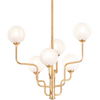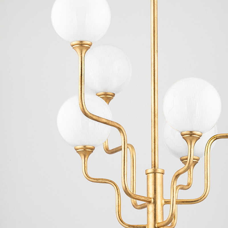 Small globes of opal cloud glass rest on sprawling, curved arms giving Onyx an uplifted and airy feel. Etched on the inside, the globes create a warm light. An extra layer of patina gives the gold leaf finish on the metal work its vintage look. Available as a single or 3 light sconce, 8 light flush mount or 6 or 12 light chandelier, there's a place for Onyx in any space.