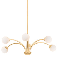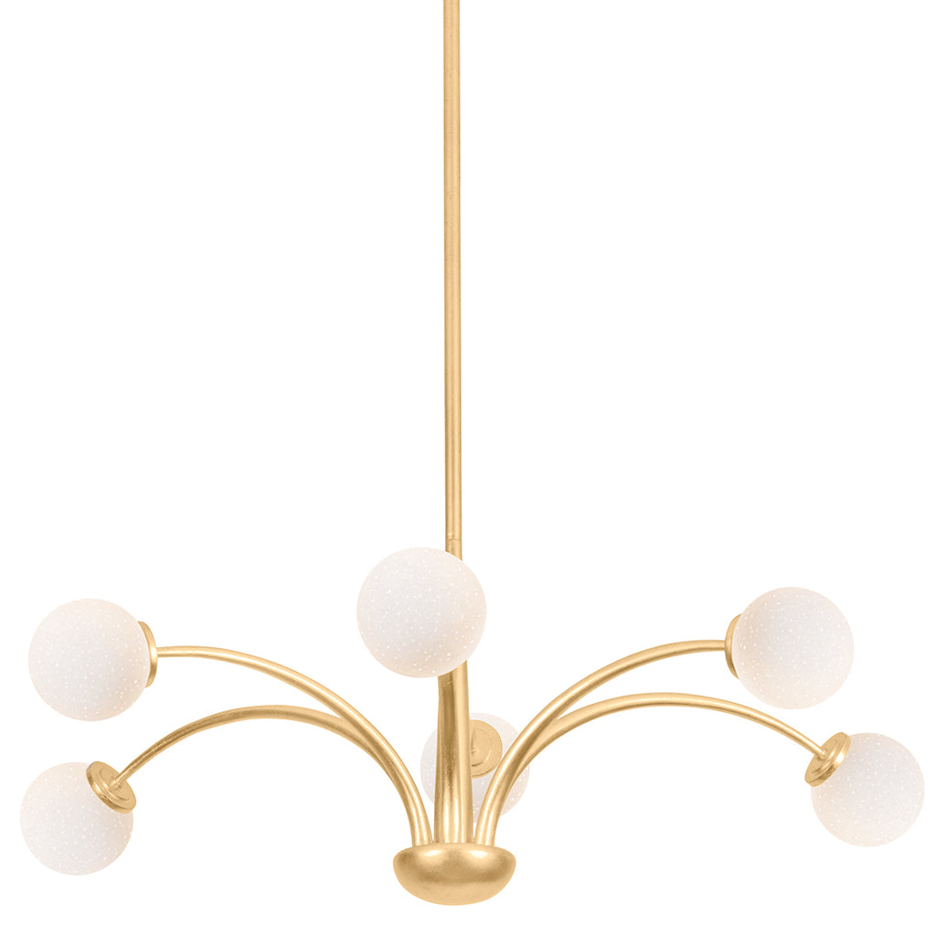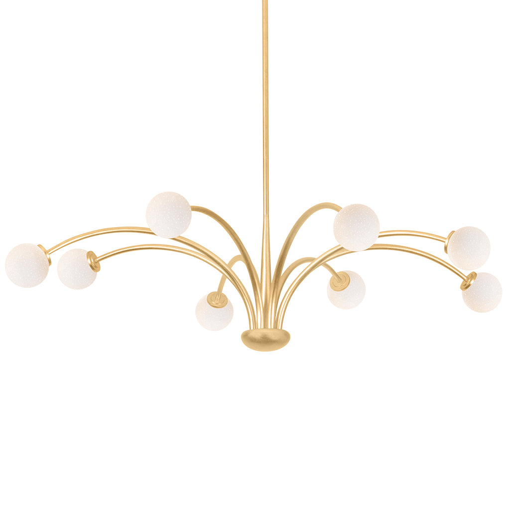 Pearl-like opal-seeded glass orbs perch on the ends of sculptural stems in the playful Orinda. Drawing from 1920s aesthetics, this fixture takes a simplified botanical silhouette and creates a whimsical statement. The Vintage Gold Leaf finish complements the overall bright, airy look. Enjoy the beauty of Orinda in various formats, including a 1-light sconce and 6 and 8-light chandeliers.