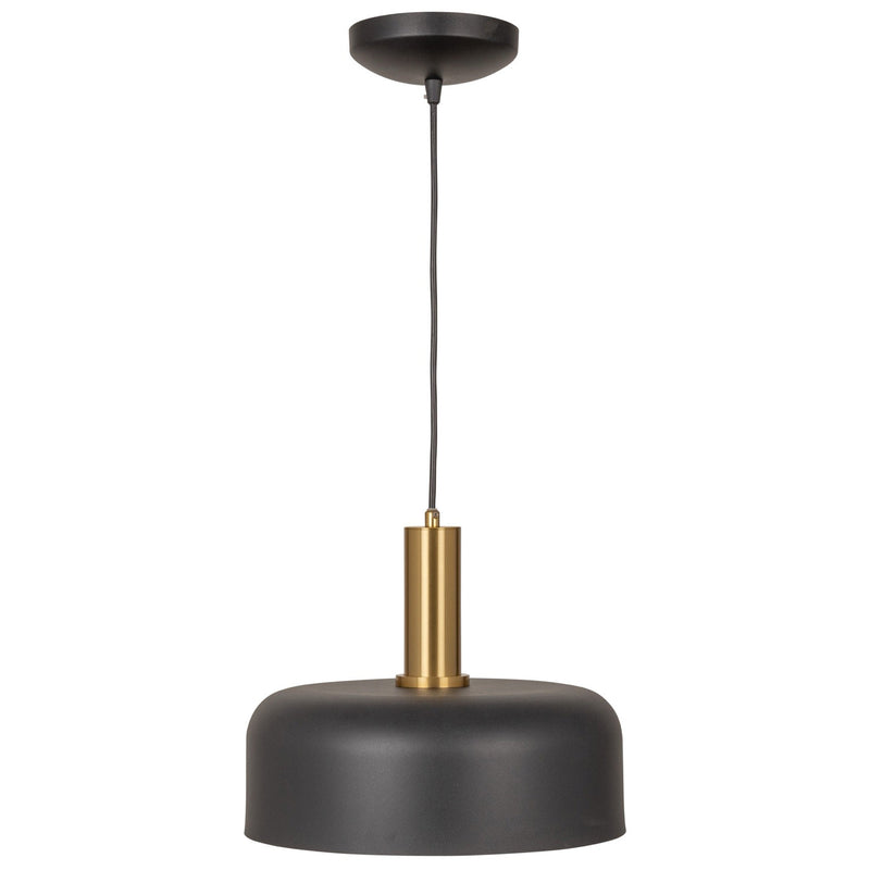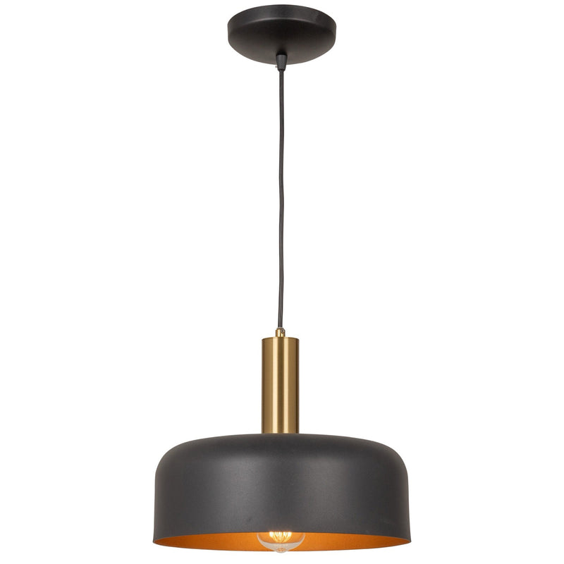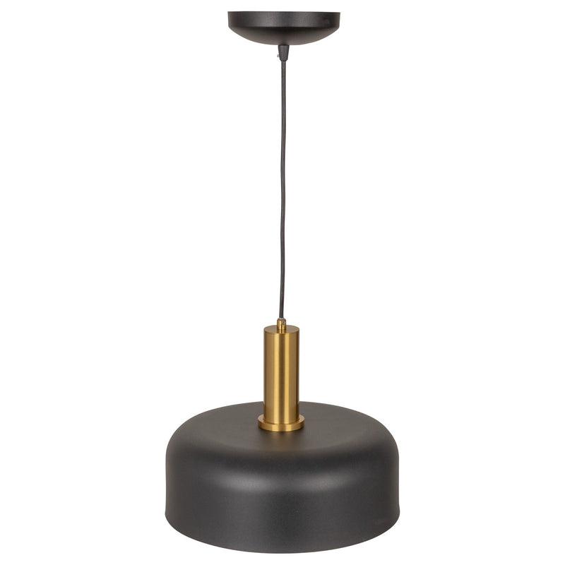 The Orsa collection pendant features a striking design, combining a sleek black metal shade with an elegant brass column. Its interior, characterized by a reflective surface, adds a touch of sophistication, creating a harmonious blend of modern aesthetics and timeless appeal.