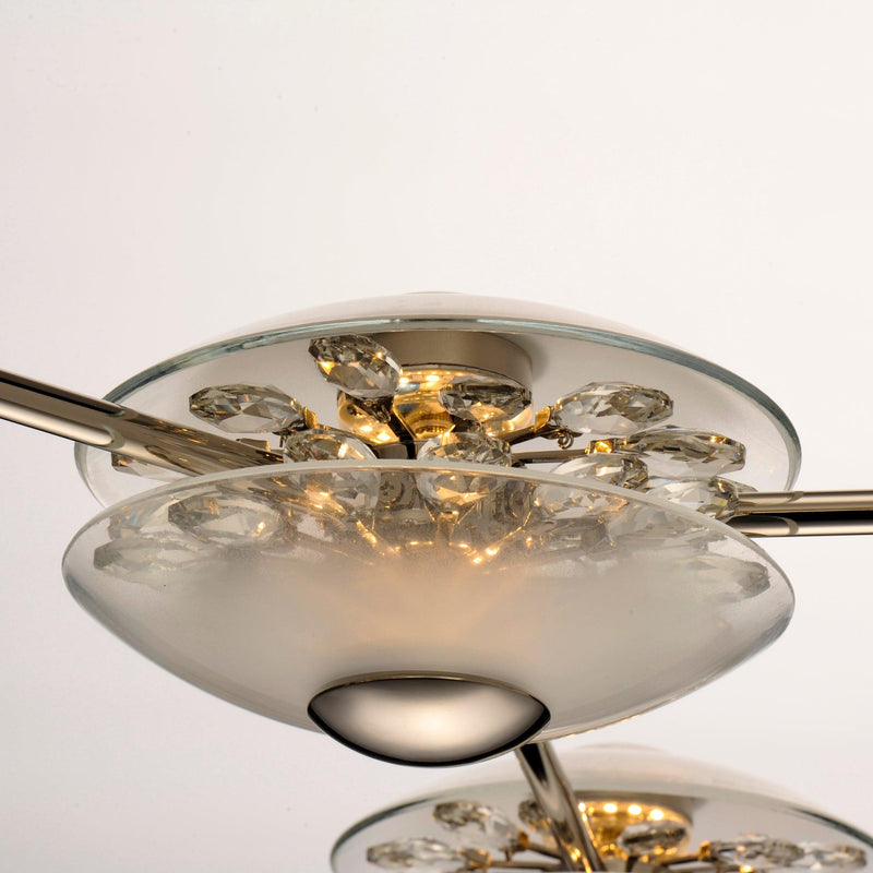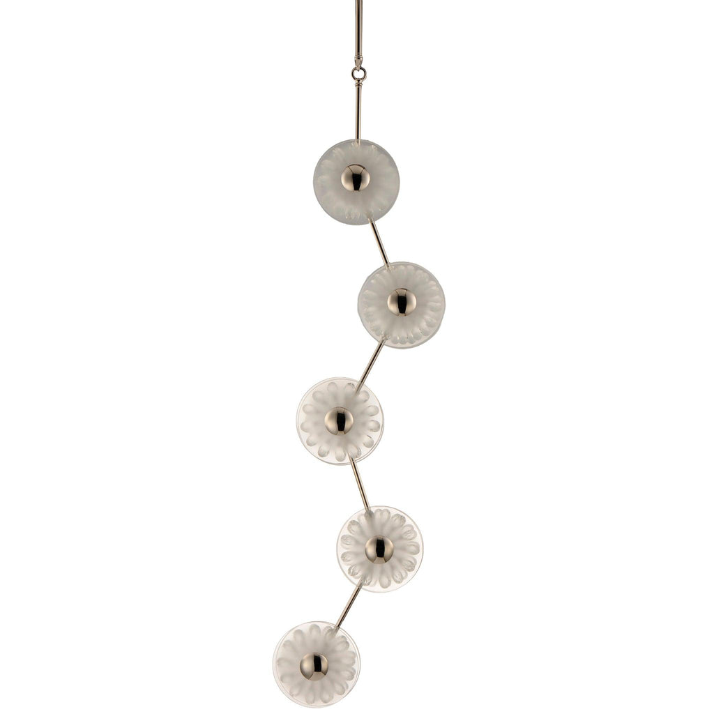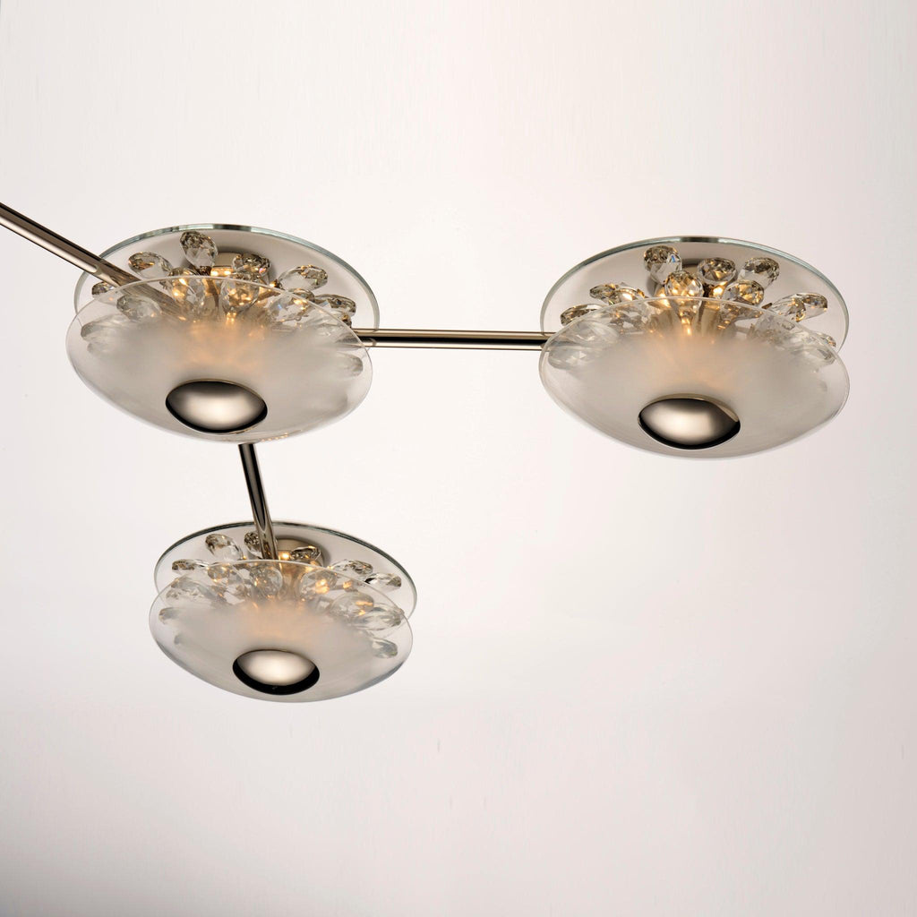 An organic cascading design, the Peony series is constructed of a freeform structure with figurative blossoms in a dazzling display of crystal. Two hand blown dishes, cloudy at their center, encase an array of crystal that span radially across a reveal in the glasses. The energy efficient LED lights illuminate the bulbous flower forms, reflecting off the crystals creating an iridescent lighting effect.