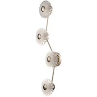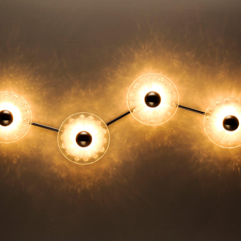 An organic cascading design, the Peony series is constructed of a freeform structure with figurative blossoms in a dazzling display of crystal. Two hand blown dishes, cloudy at their center, encase an array of crystal that span radially across a reveal in the glasses. The energy efficient LED lights illuminate the bulbous flower forms, reflecting off the crystals creating an iridescent lighting effect.