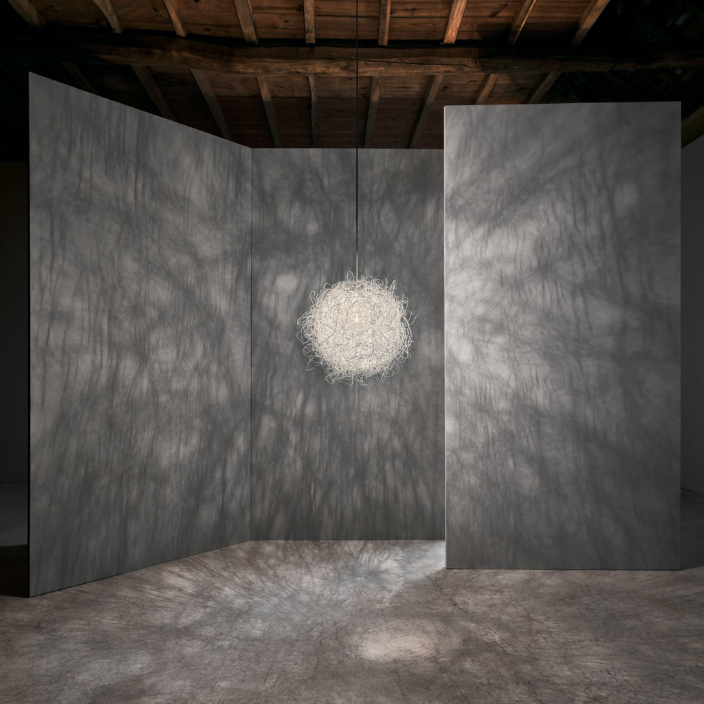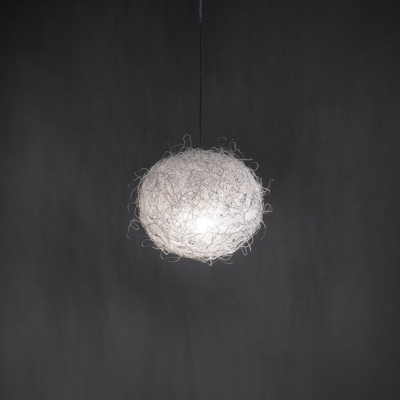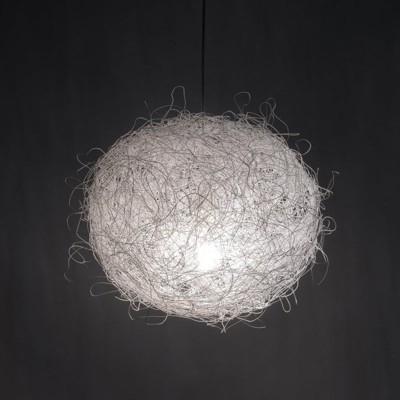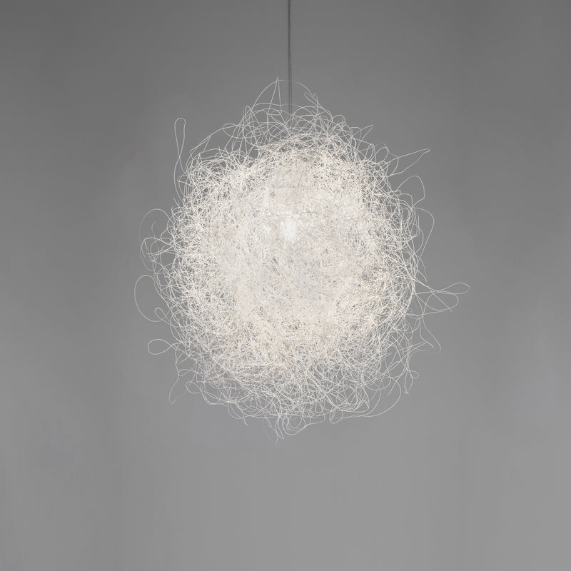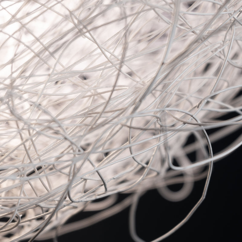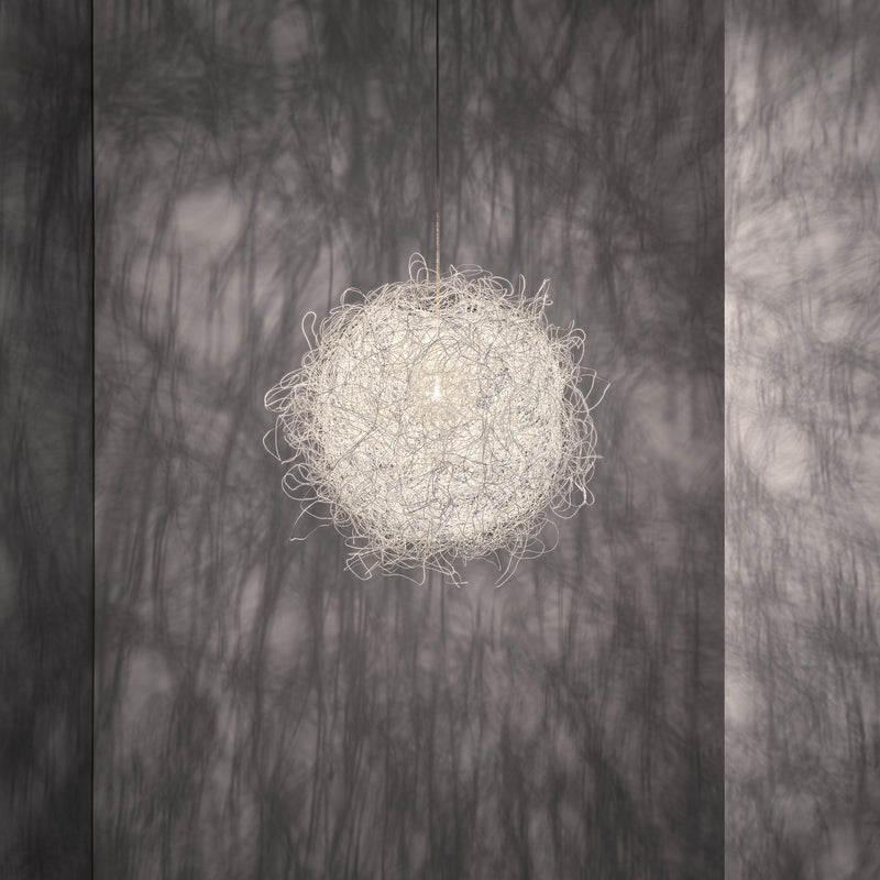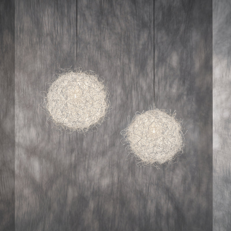 The Pili mini pendant lamp is a single thread of painted stainless steel that intertwines creating random volumes without order, weaving a harmonious and enveloping irregularity full of charm and mystery. This skein through which light escapes is handmade in Spain. The collection is presented in 3 lamp sizes that allow you to create compositions of great visual impact.