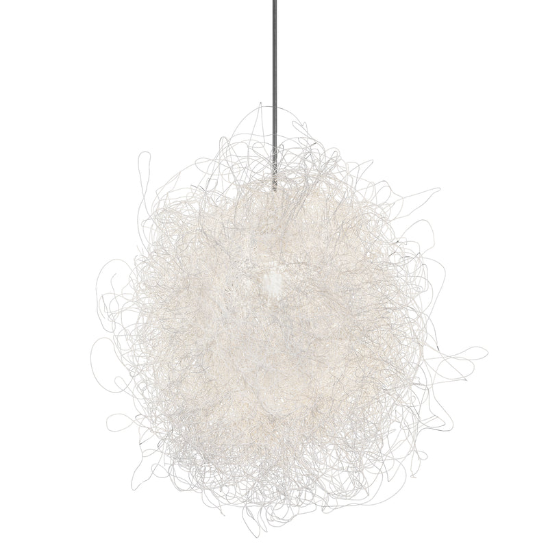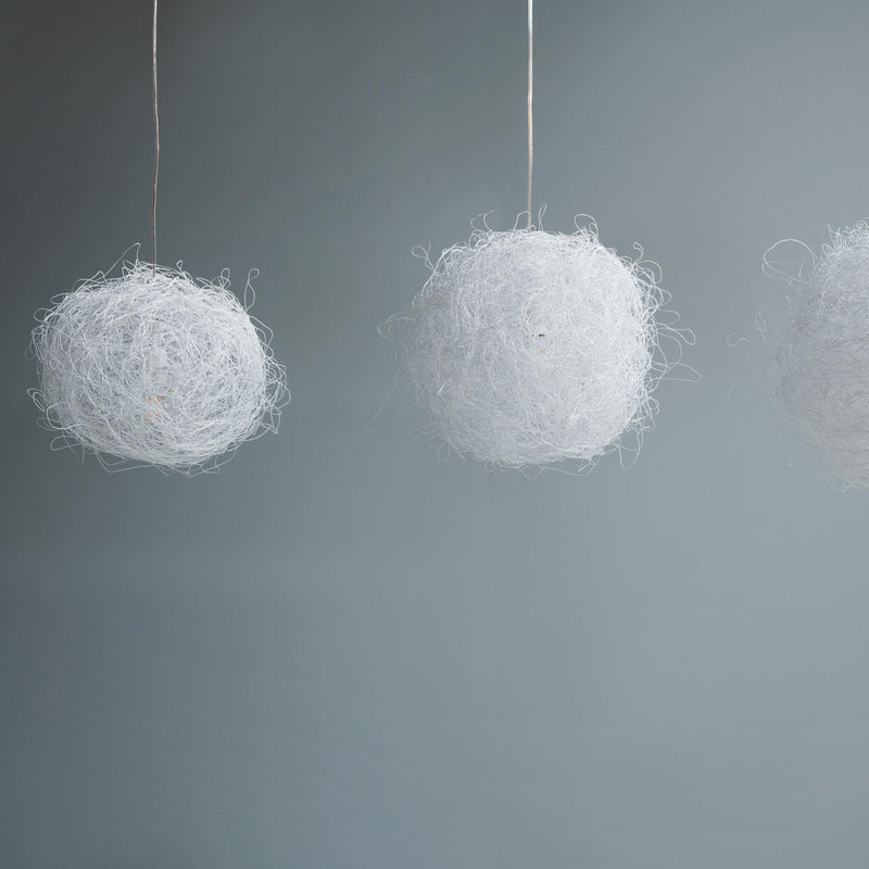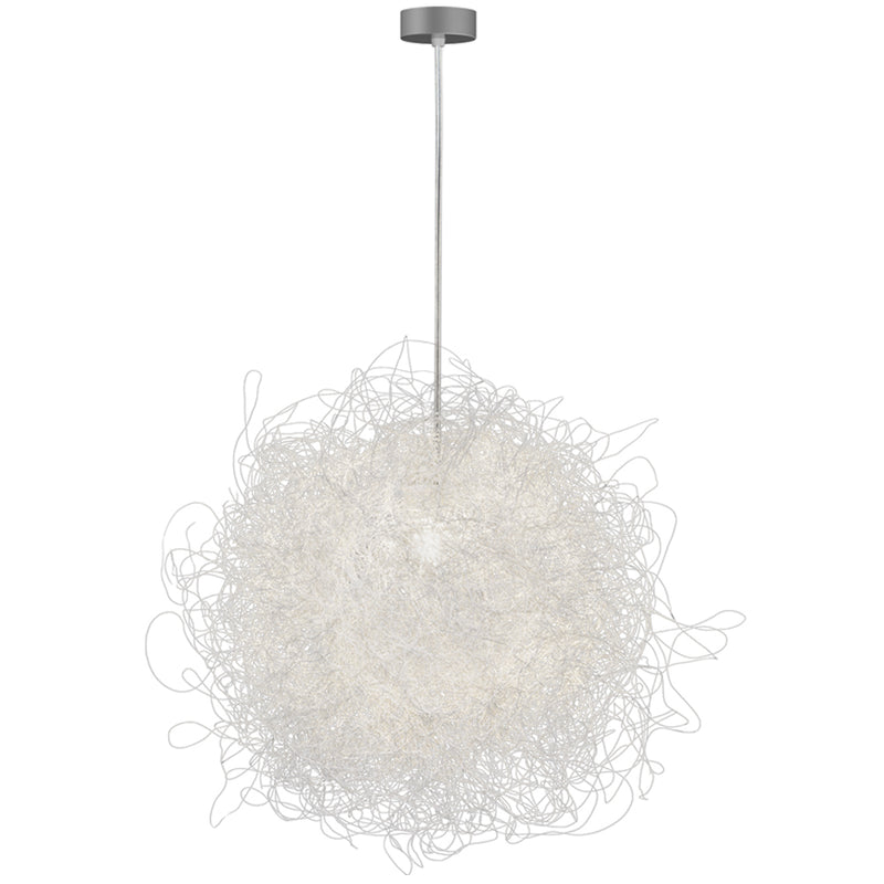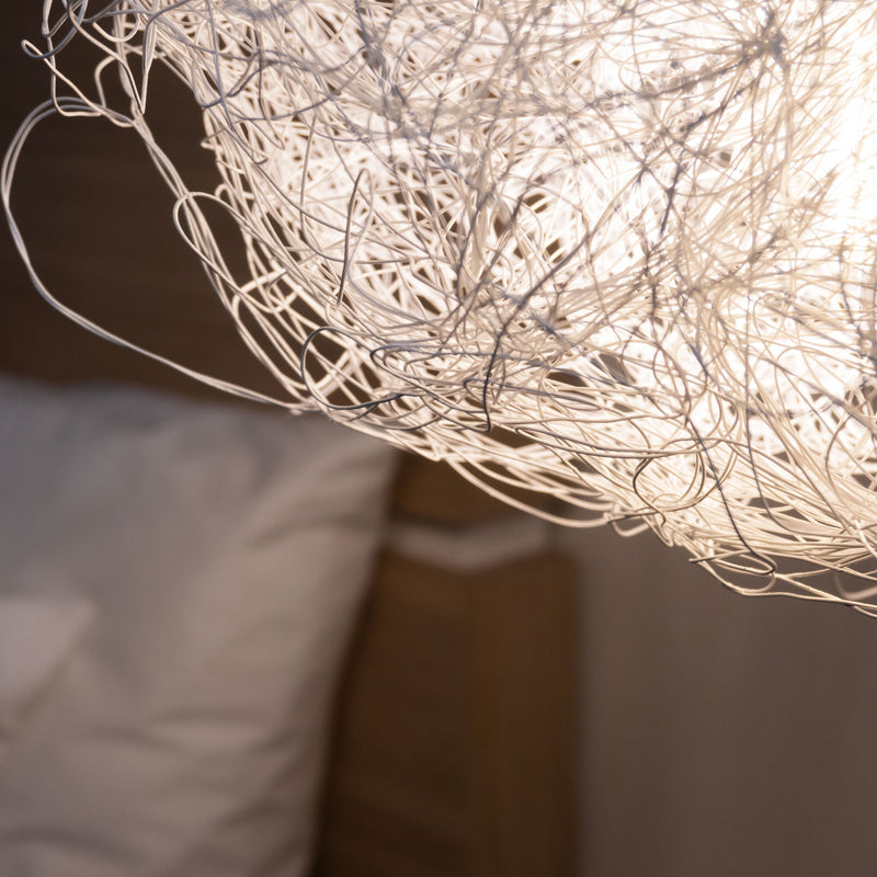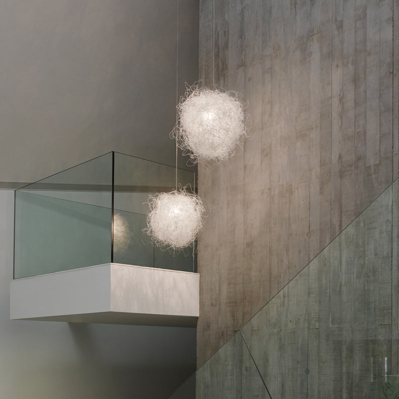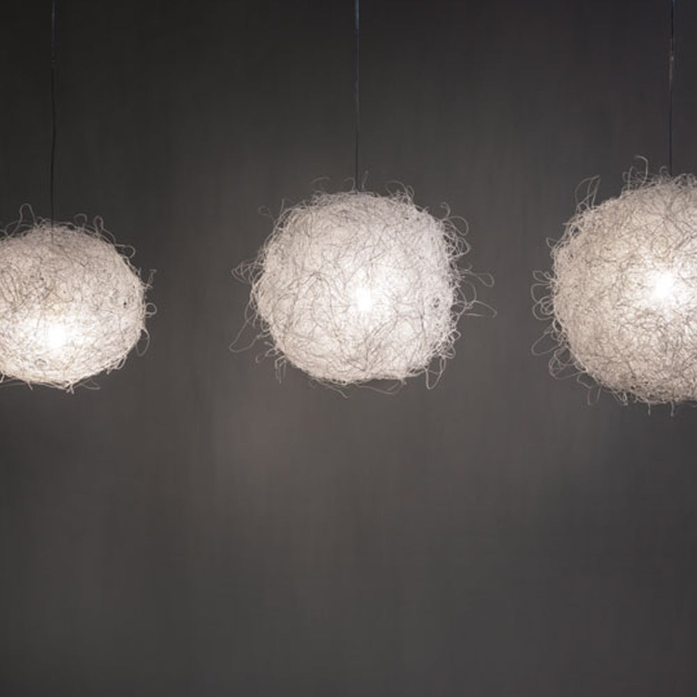 The Pili mini pendant lamp is a single thread of painted stainless steel that intertwines creating random volumes without order, weaving a harmonious and enveloping irregularity full of charm and mystery. This skein through which light escapes is handmade in Spain. The collection is presented in 3 lamp sizes that allow you to create compositions of great visual impact.