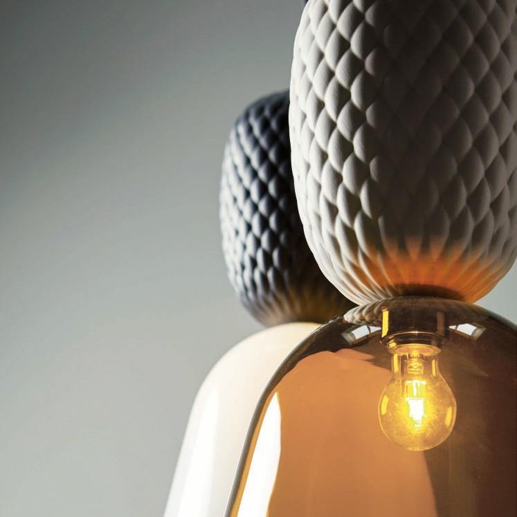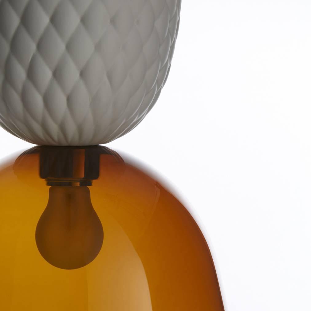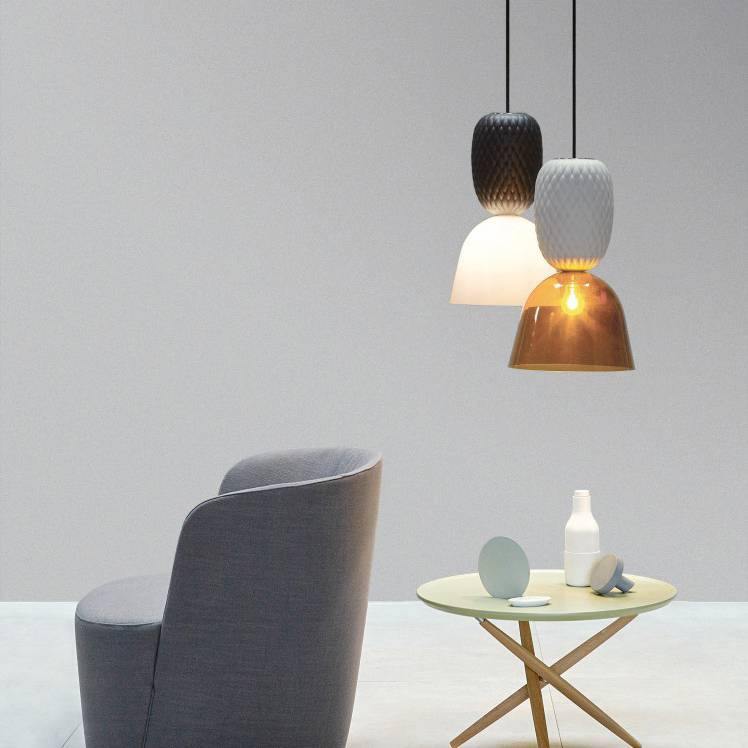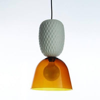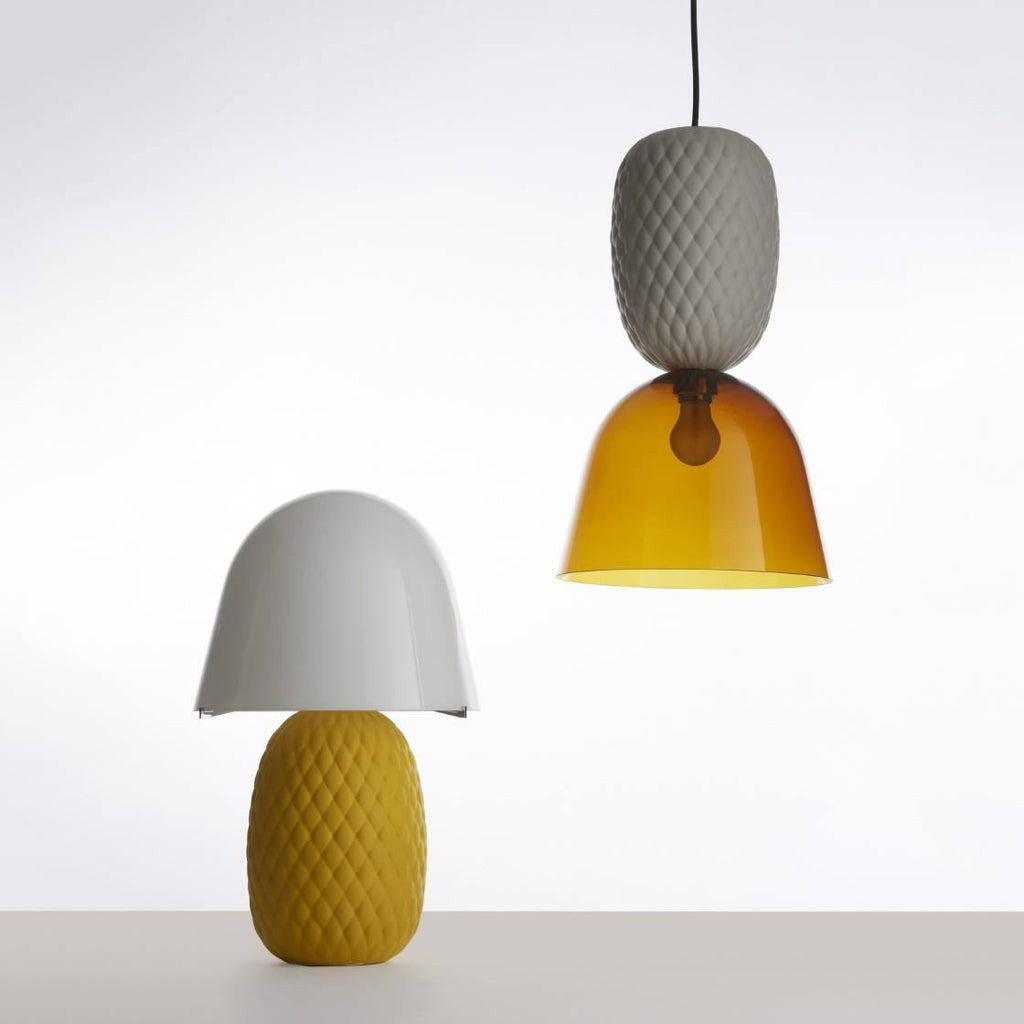 The creation of this Pineapple Pendant Light by MM Lampadari is inspired from the classic handmade tradition of making lamps. The well-cut sleek glass of this lampshade features an opaque pottery base with diamond shape pattern. Available in yellow pineapple with white glass, black pineapple with transparent glass, and grey pineapple with tobacco glass, the enthralling suspension diffuses balmy light. The illumination creates intimate and harmonious atmosphere, perfect for personal lounge, dining area, open gallery, balconies, bedroom, and over kitchen islands. The simple yet eye-catching design of this lamp is perfect for any contemporary interior.